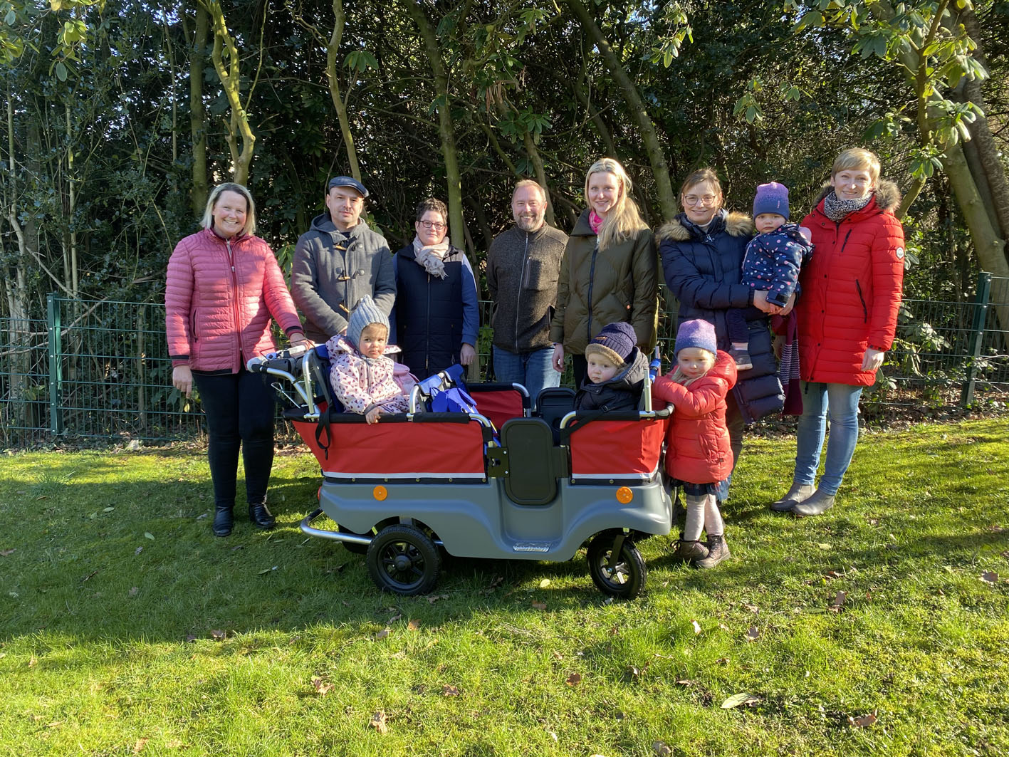 Eltern, Erzieherinnen und die Kids vom Familienzentrum Kleine Strolche freuen sich über den neuen Krippenwagen.