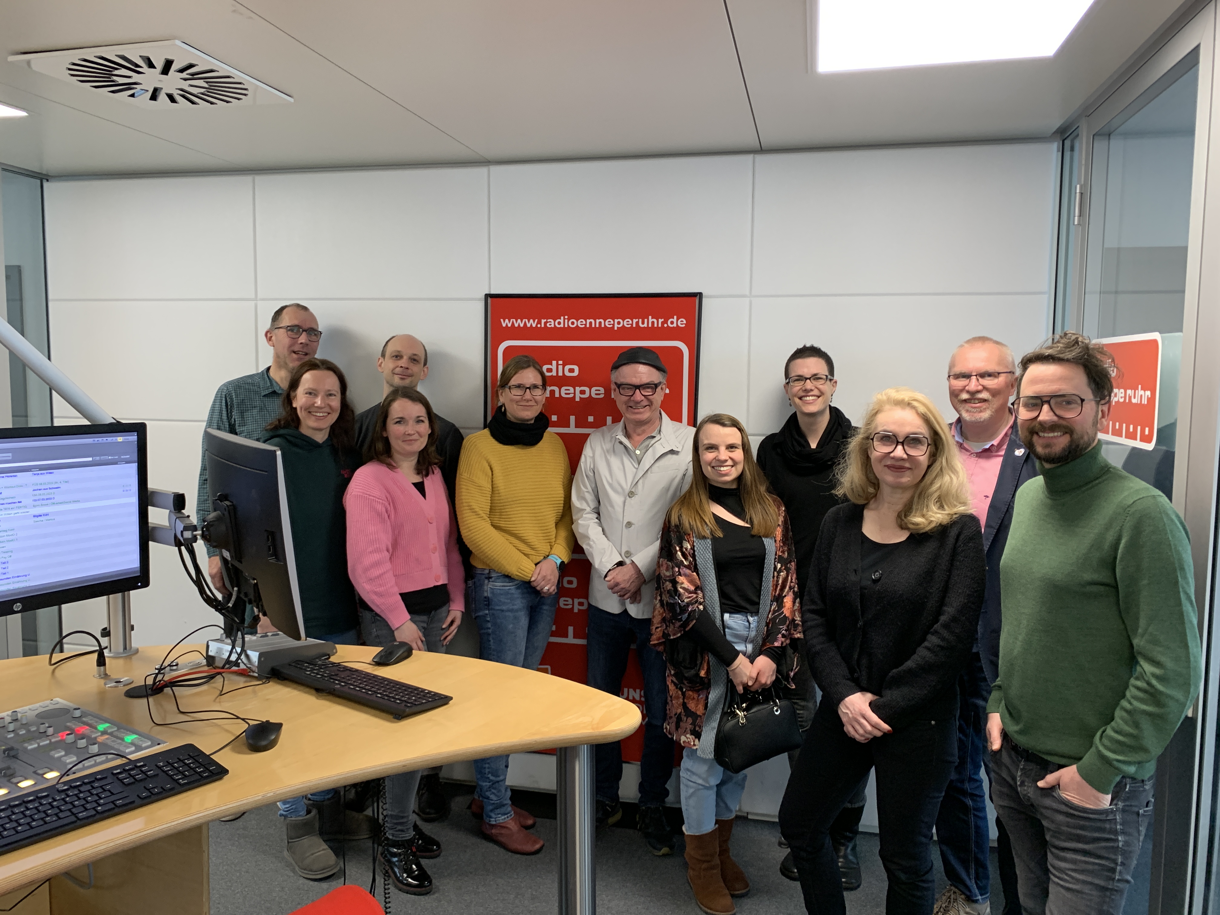 Georg Rose (Bildmitte) und Sascha Lewandowski (rechts) informierten die Pressesprecherinnen und Pressesprecher von Kreis- und Stadtverwaltungen über den Neustart von radio ennepe ruhr. Pressesprechende von links: Ingo Niemann (Ennepe-Ruhr-Kreis), Martina Elsche (Wetter/Ruhr), Jörg Schäfer (Witten), Lena Siegel (Herdecke), Franziska Horsch (Ennepe-Ruhr-Kreis), Lisa Radtke (Ennepe-Ruhr-Kreis), Lena Kücük (Witten), Susanne Wegemann (Hattingen) und Hans Günther Adrian (Ennepetal)/Foto: UvK/Ennepe-Ruhr-Kreis