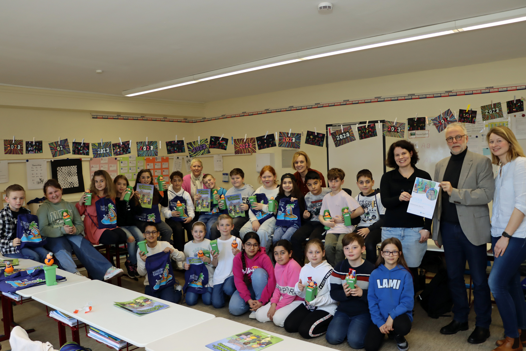 Zusammen mit Kerstin Walberg von den Hertener Stadtwerken (h. l.) und Andrea Eckert vom ZBH (h. r.) überreichte Bürgermeister Matthias Müller (2. v. r.) der Siegerklasse im Beisein der Schulleiterin Stephanie Brauchmann-Mai (r.) und der Klassenlehrerin Anja Neudenberger (3. v. r.) ihren Preis.