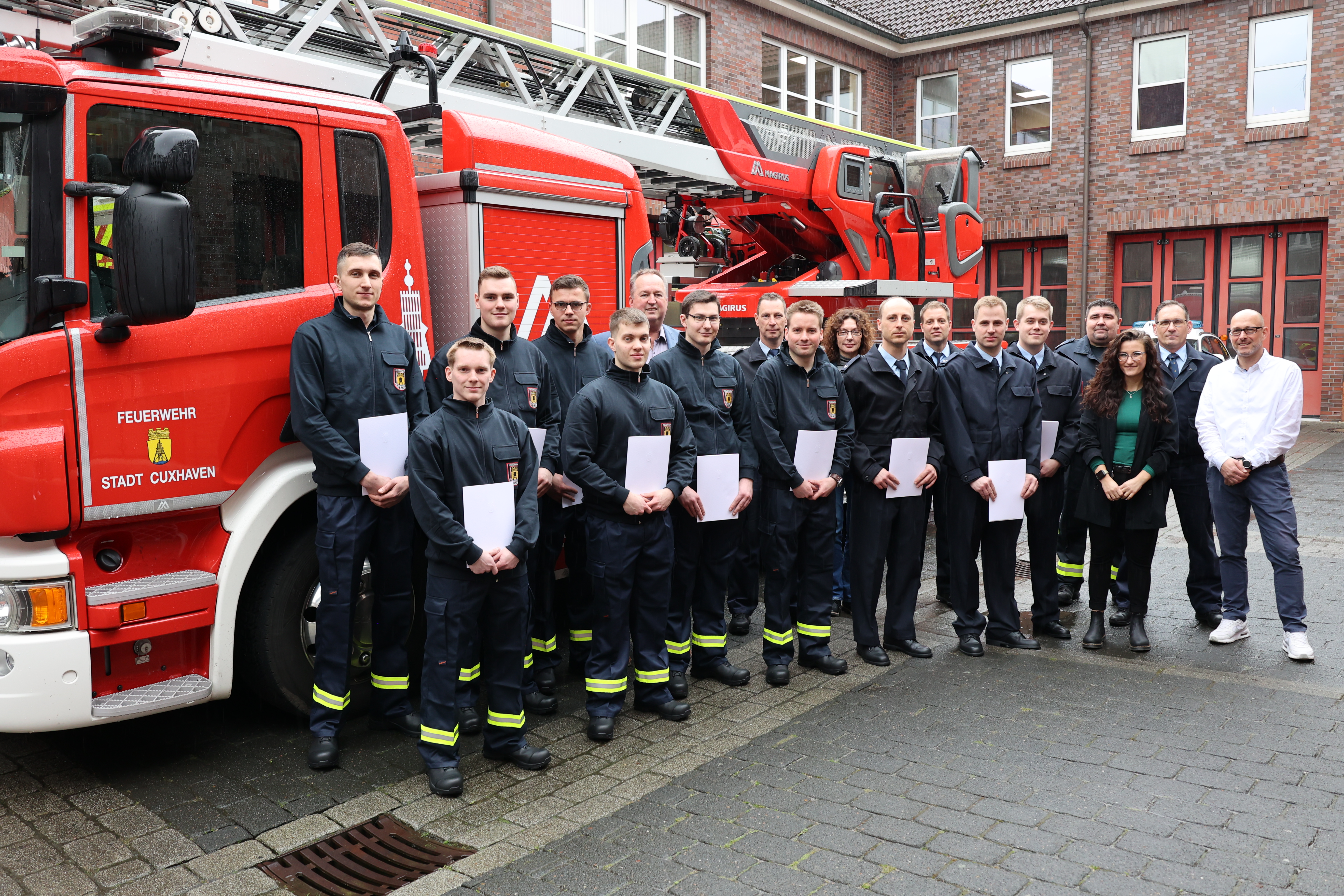 Die neue Brandmeister-Anwärter gemeinsam mit denjenigen, die ihre Ausbildung bereits erfolgreich abgeschlossen haben und nun den nächsten Schritt machen. Foto: Stadt Cuxhaven