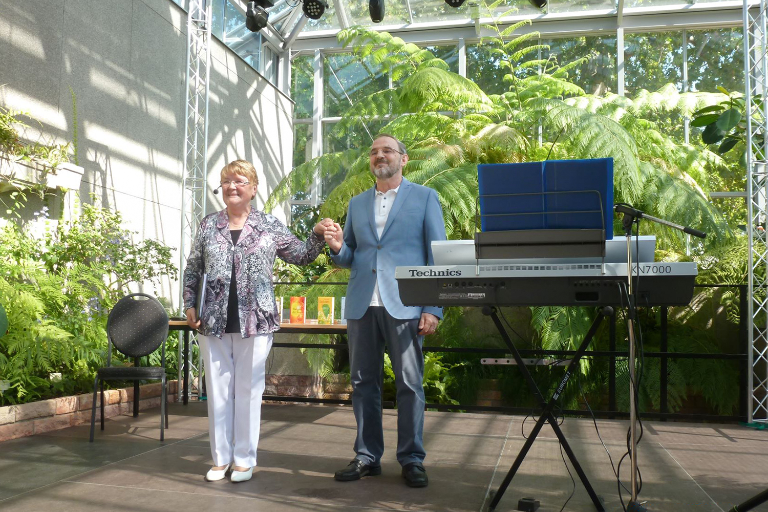 Die Lyrikerin Helga Schettge und der Musiker Georg Merbt auf der Matinee-Bühne im Farnhaus der Gruson Gewächshäuser Magdeburg.