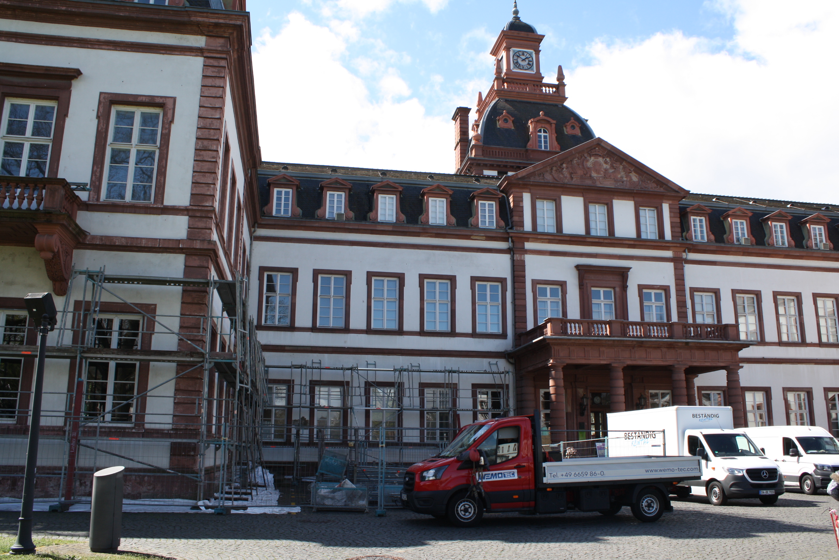 Nachdem die Arbeiten am Südflügel des Schlosses Philippsruhe fast abgeschlossen sind, beginnt derzeit bereits der Gerüstaufbau am zentralen Mitteltrakt.