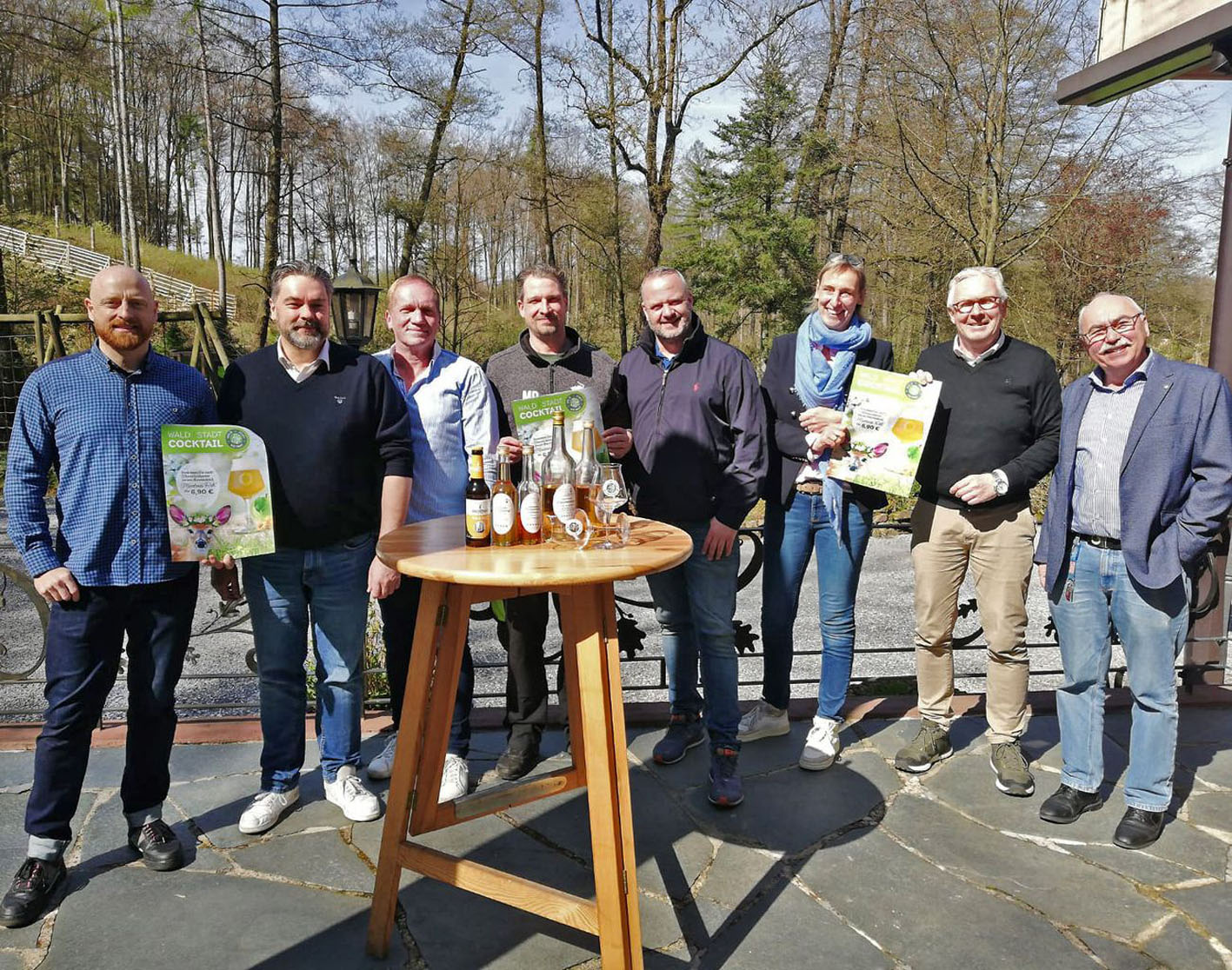 Präsentierten die „Sommer-Variante“ des Iserlohner "Wald I Stadt I Cocktails“ (v.l.: Frederec Neuhaus (Romantik Hotel Neuhaus), Christian Speerschneider (Jagdhaus im Kühl), Thorsten Wegener (Barmeister aus Altena), Markus Dörnen (Gasthof Zobel zur Post), Jens Neffin (Forsthaus Löhen), Susanne Schlüter (Hotel VierJahreszeiten), Dirk Matthiessen (Stadtmarketingleiter) und Dieter Zettier (Sauerländer Genussmanufaktur).