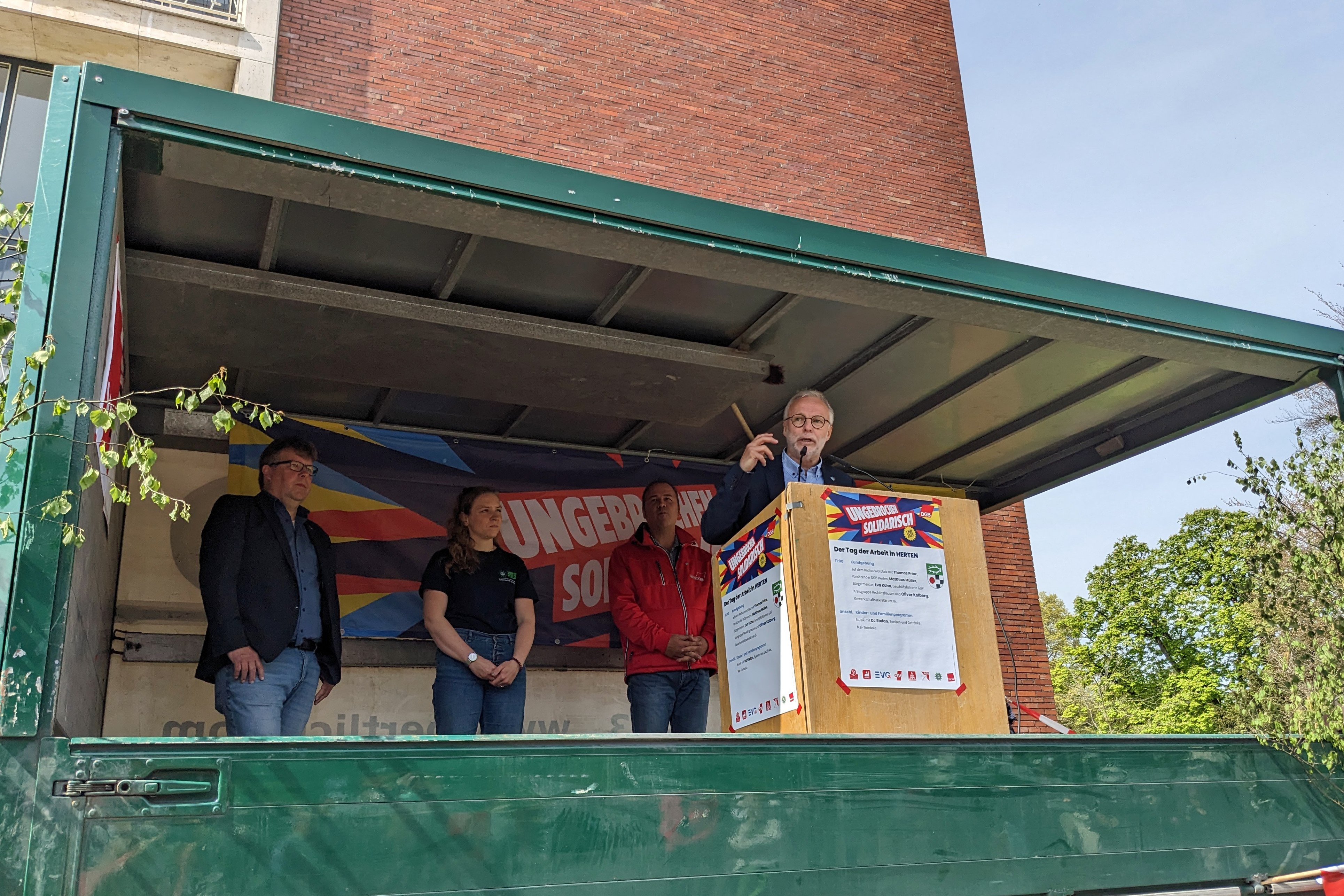 Bürgermeister Matthias Müller forderte in seiner Rede: „Wir brauchen als Gesellschaft solidarisches Handeln. Der 1. Mai ist der Tag, an dem wir von Solidarität sprechen, der 2. Mai jedoch umso wichtiger. An diesem Tag sollten wir Solidarität leben – nicht nur im Alltags-, sondern auch im Berufsleben, eben überall dort, wo wir Menschen uns befinden“ (Foto: Stadt Herten).