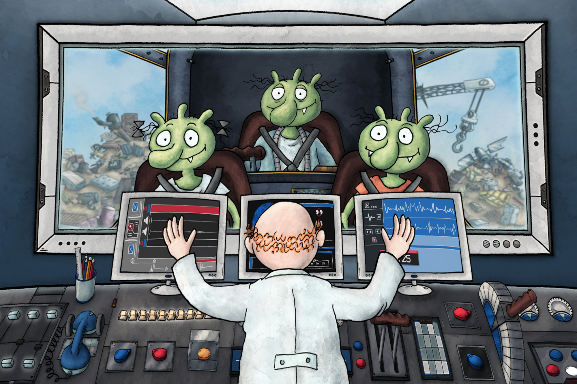 Die Olchi-Kinder warten zusammen mit Olchi-Opa darauf, dass sie der Drache Feuerstuhl an den Rand der Erdatmosphäre trägt.