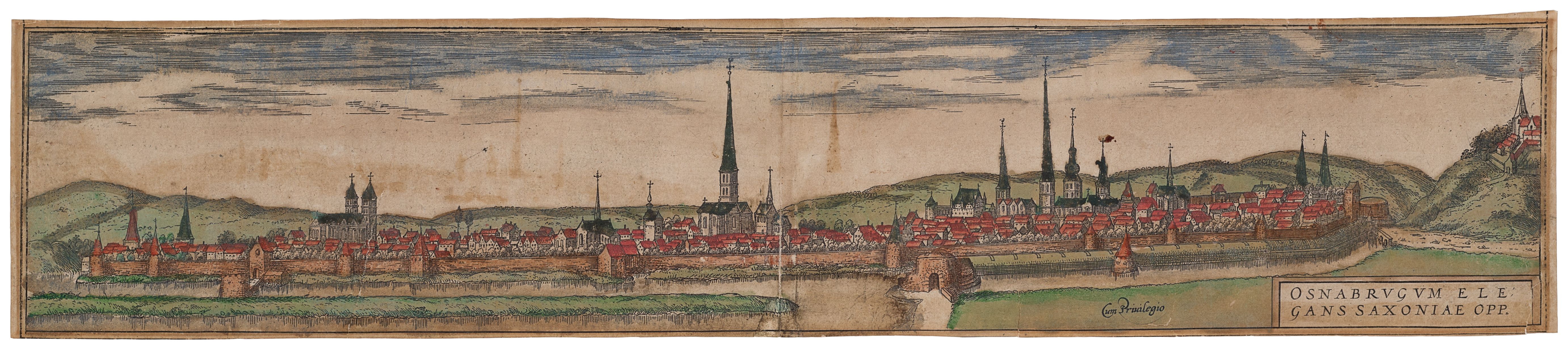 Stadtansicht, Kupferstich, koloriert, aus: Civitates orbis terrarum Liber I, Antwerpen: Philipp Galle / Köln: Georg Braun u. Franz Hogenberg 1572, Bl. 2