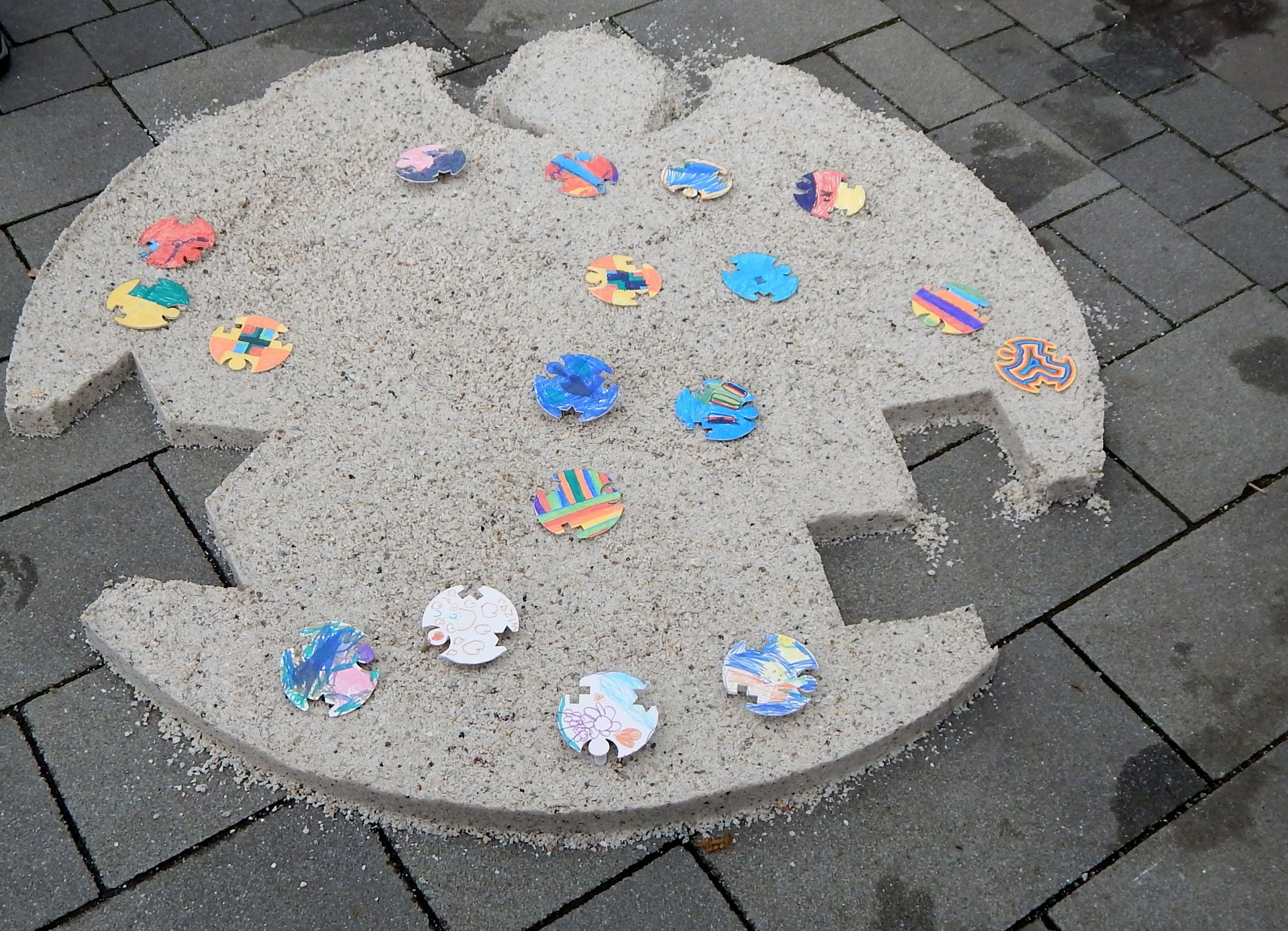 Kinder und Jugendliche schufen am Aktionstag kunstvolle Sandabdrücke aus dem inneren Ring des „Engels der Kulturen“.