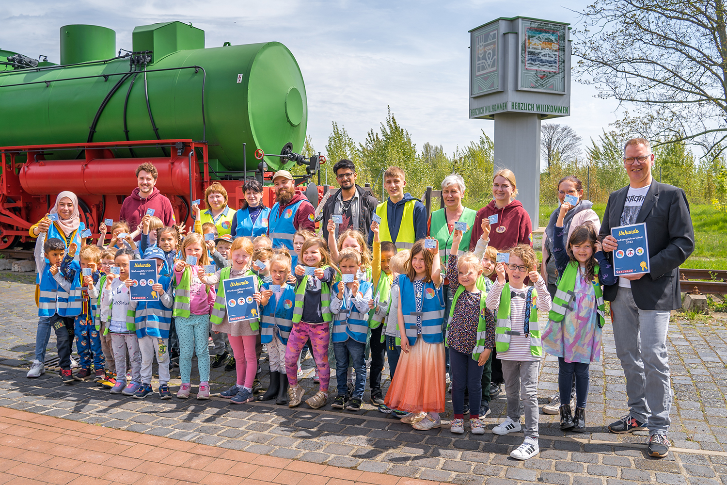 Die Kinder der Kitas "Mandala" und "Ohana" zeigen stolz Ihre Werkzeugführerscheine im Technikmuseum vor.