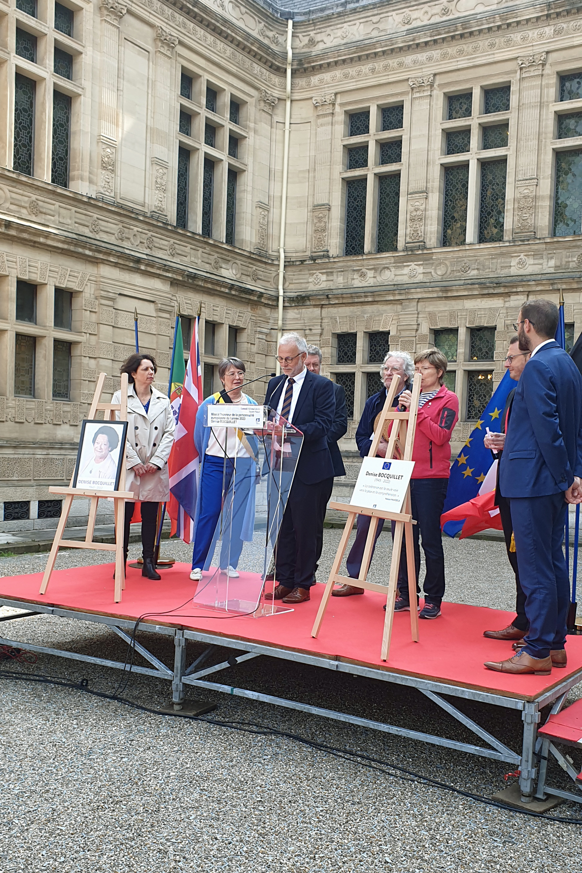 Beim Festakt vor dem Rathaus ehrte auch Bürgermeister Matthias Müller (am Rednerpult) Denise Bocquillet.