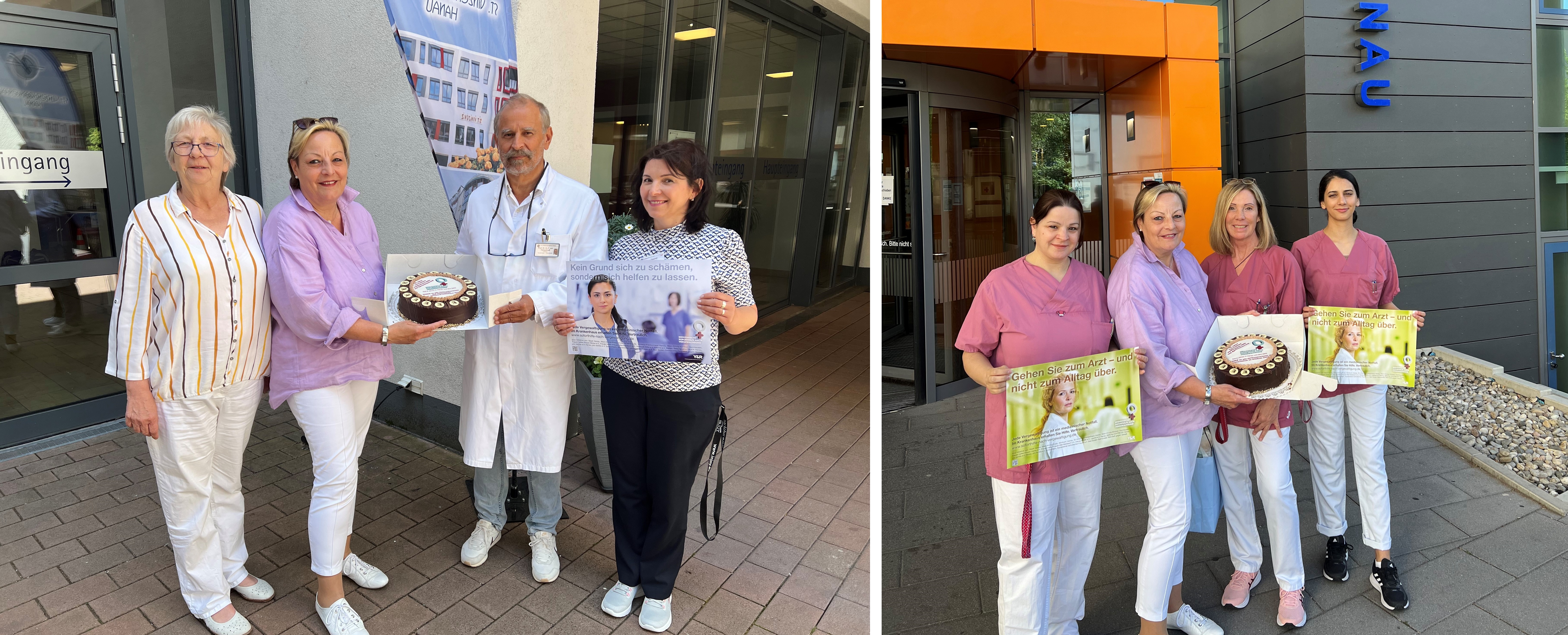 Eine Torte als Geste des Dankes – an die Teams von Klinikum Hanau und St. Vinzenz-Krankenhaus. Team St. Vinzenz-Krankenhaus (linkes Foto): Jutta Berg (Pflegedirektorin), Cornelia Gasche (Hanauer Frauenbeauftragte), Prof. Dr. med. Georg-Friedrich von Tempelhoff (Chefarzt der Gynäkologie), Daniela Orendi (Chefsekretärin und Krankenschwester) Team Klinikum Hanau (rechtes Foto): Judith Kern (Medizin. Fachangestellte in der Gynäkologischen Ambulanz), Cornelia Gasche (Hanauer Frauenbeauftragte), Elke Baumann (Teamleiterin der Gynäkologischen, onkologischen Ambulanz/ Frauenklinik), Nujin Sevilgen (med. Fachangestellte in der Gynäkologischen Ambulanz)
