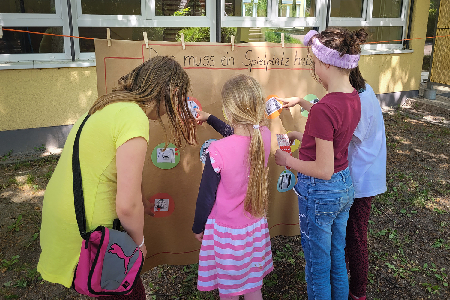 Kinder stehen vor einem Plakat und stimmen dort über wichtige Gestaltungselemente von Spielplätzen ab.