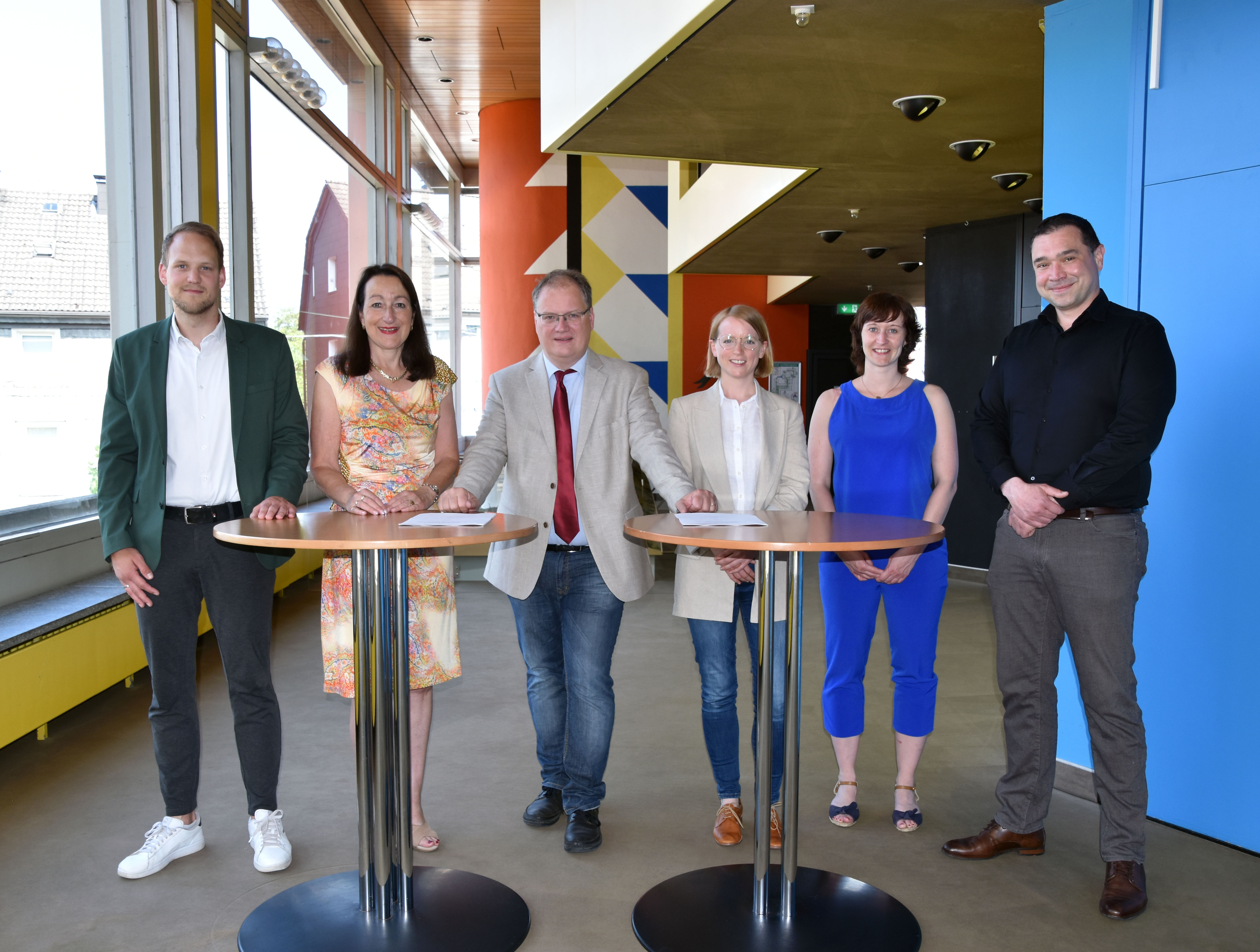 Freuen sich auf die weitere Zusammenarbeit: Joel Stieglitz, zuständiger Abteilungsleiter der Kreisverwaltung, Fachbereichsleiterin Astrid Hinterthür und Landrat Olaf Schade sowie von der Lebenshilfe Ennepe-Ruhr/Hagen Katharina Nebel, Bereichsleitung Familien Unterstützender Dienst und Prokuristin Lebenshilfe Inklusions Gesellschaft gGmbH, Teresa Schulte und Jens Wilk, Leiterin und stellvertretender Leiter der Schulinklusion.