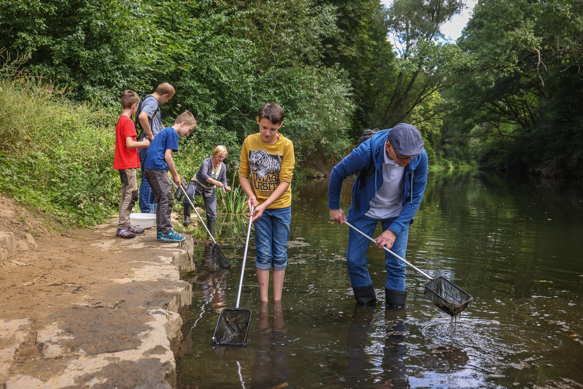 Mit Kescher und Lupe bewaffnet erforschen die Teilnehmer*innen die Lippe.