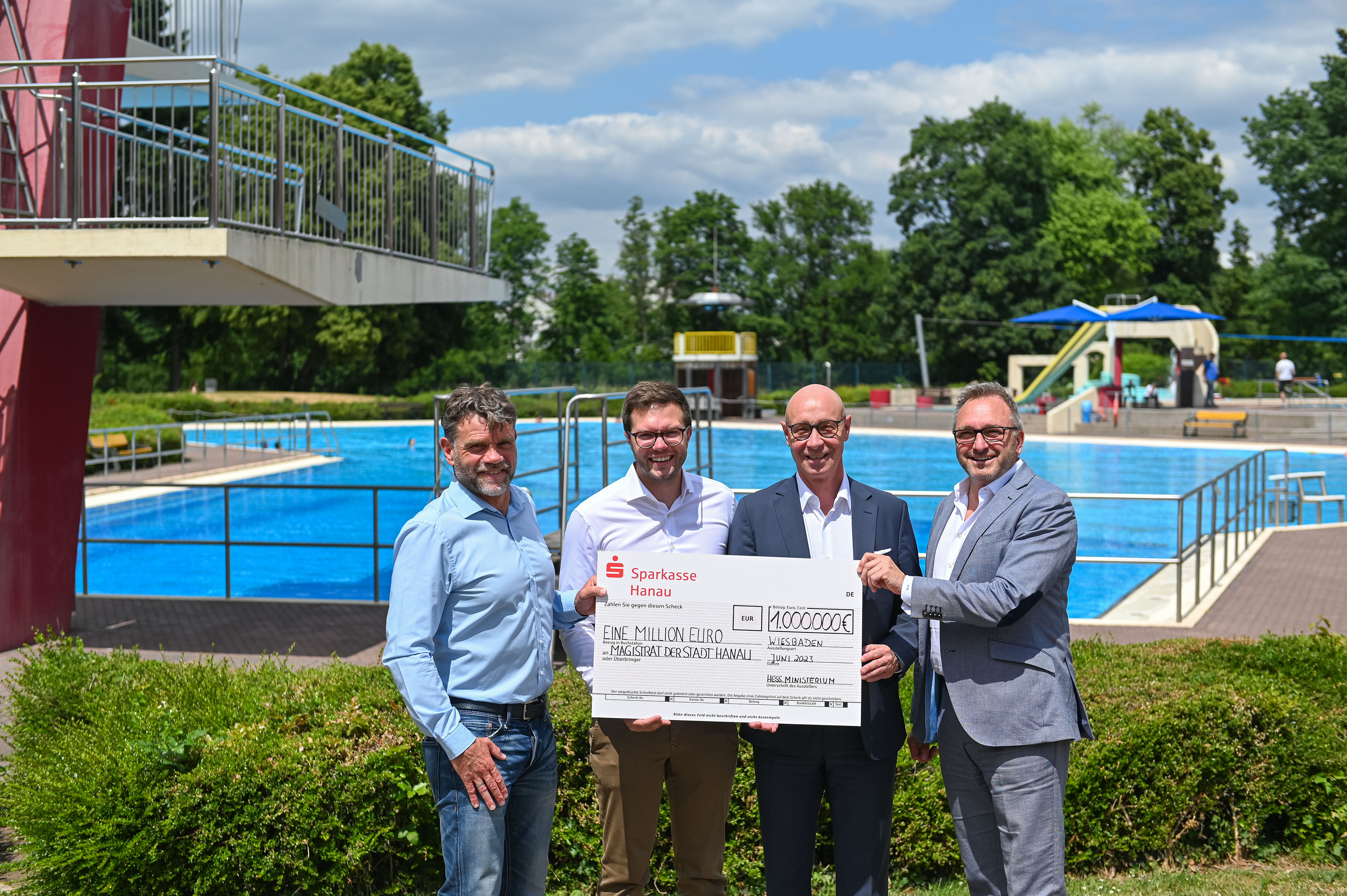 Nahmen bei einem Vor-Ort-Termin den symbolischen Scheck entgegen: Uwe Weier, Geschäftsführer der Hanau Bäder GmbH, Bürgermeister Dr. Maximilian Bieri, Markus Menzen, Geschäftsführer der BeteilungsHolding Hanau GmbH sowie Architekt Matthias Marhöfer (von links).
