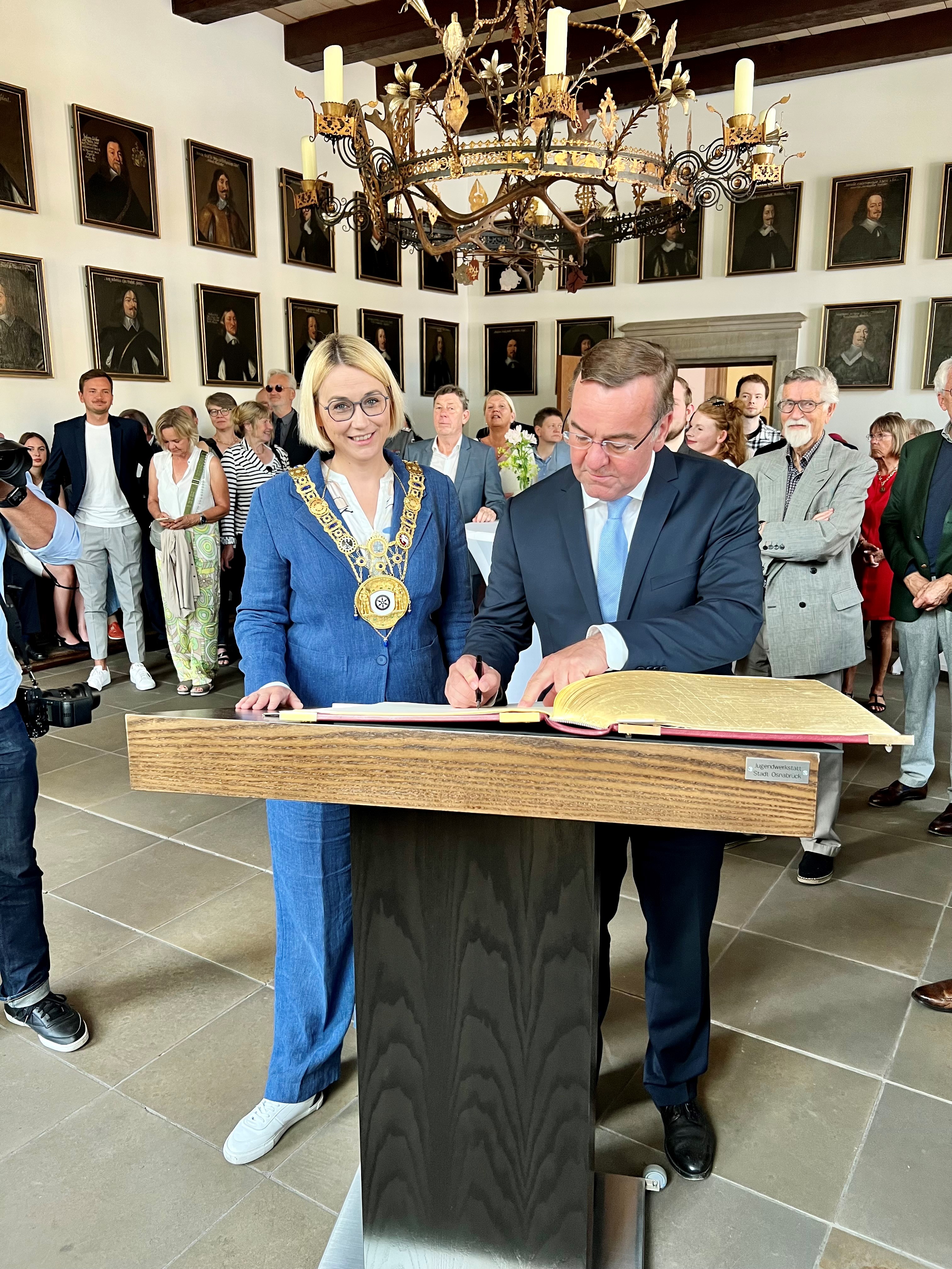 Oberbürgermeisterin Katharina Pötter begrüßte den Bundesminister der Verteidigung, Boris Pistorius, im Friedenssaal der Stadt Osnabrück. Dort trug er sich offiziell ins Goldene Buch ein.
