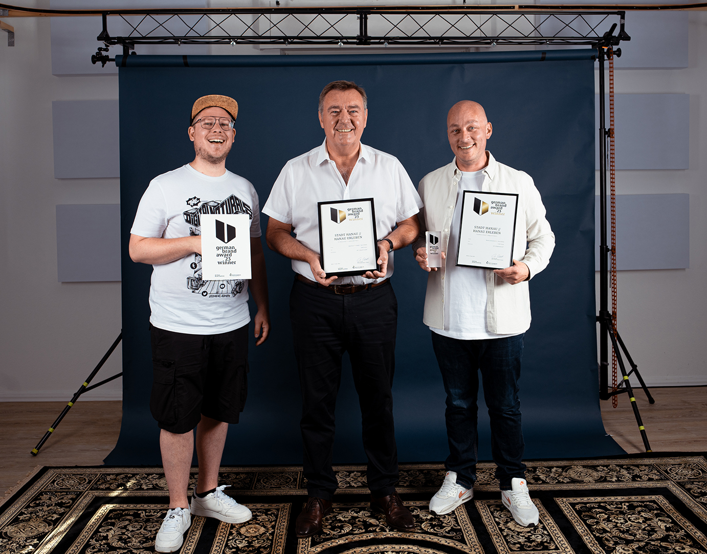 Die Stadt Hanau und ‚digitalnaturals*‘ sind in der vergangenen Woche für ihre kreative Zusammenarbeit bei der Entwicklung einer erfolgreichen Markenstrategie und der effektiven Nutzung sozialer Medien mit dem renommierten „German Brand Award“ in Berlin ausgezeichnet worden. Das Foto zeigt (von links) Lukas Koltermann (dn), Oberbürgermeister Claus Kaminski und Lutz Hanus (dn).