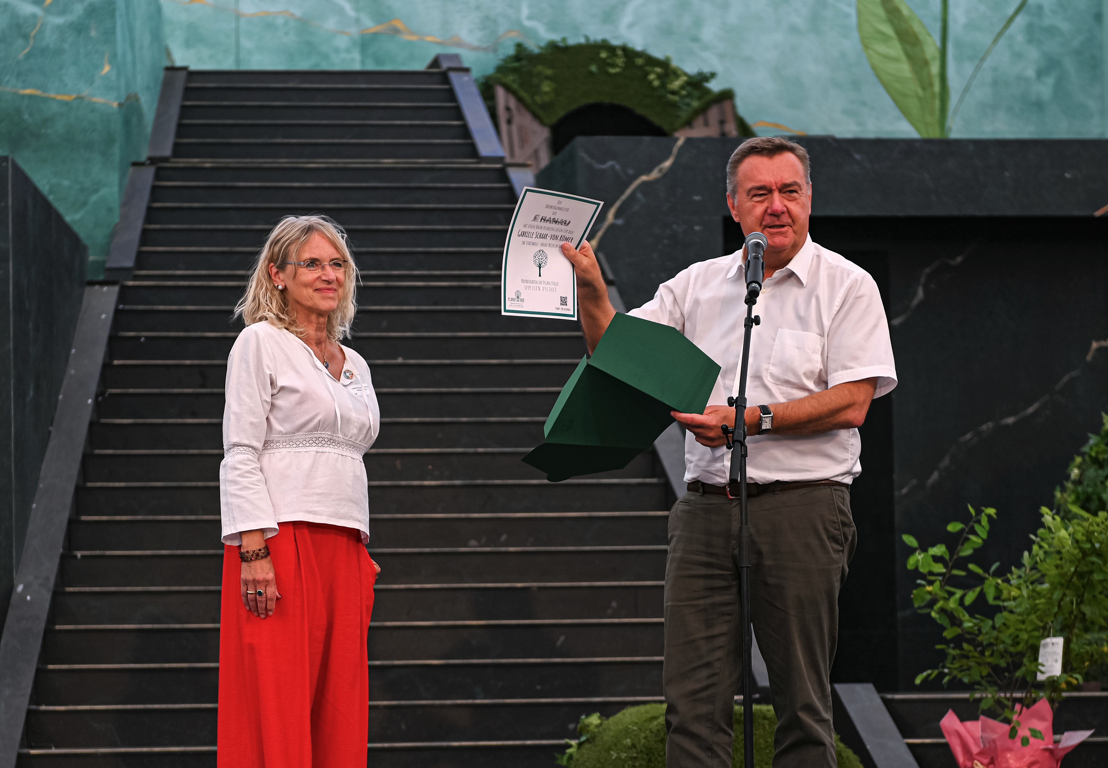 Am Ende der Veranstaltung wurde Gabriele Schaar-von Römer, die langjährige Leiterin des Umweltzentrums Hanau, von Oberbürgermeister Claus Kaminsky in den Ruhestand verabschiedet.