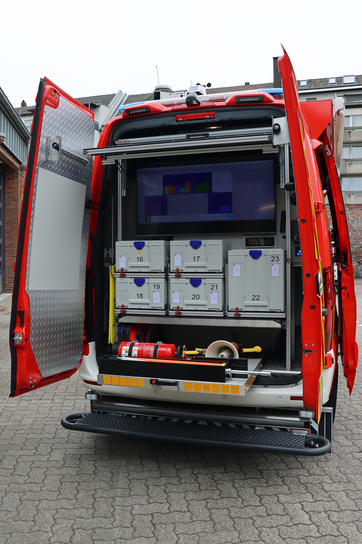 Im Fahrzeugheck befinden sich ein großer Monitor für Lagebesprechungen und verschiedene Transportkisten mit wichtigen Einsatzmaterialien.