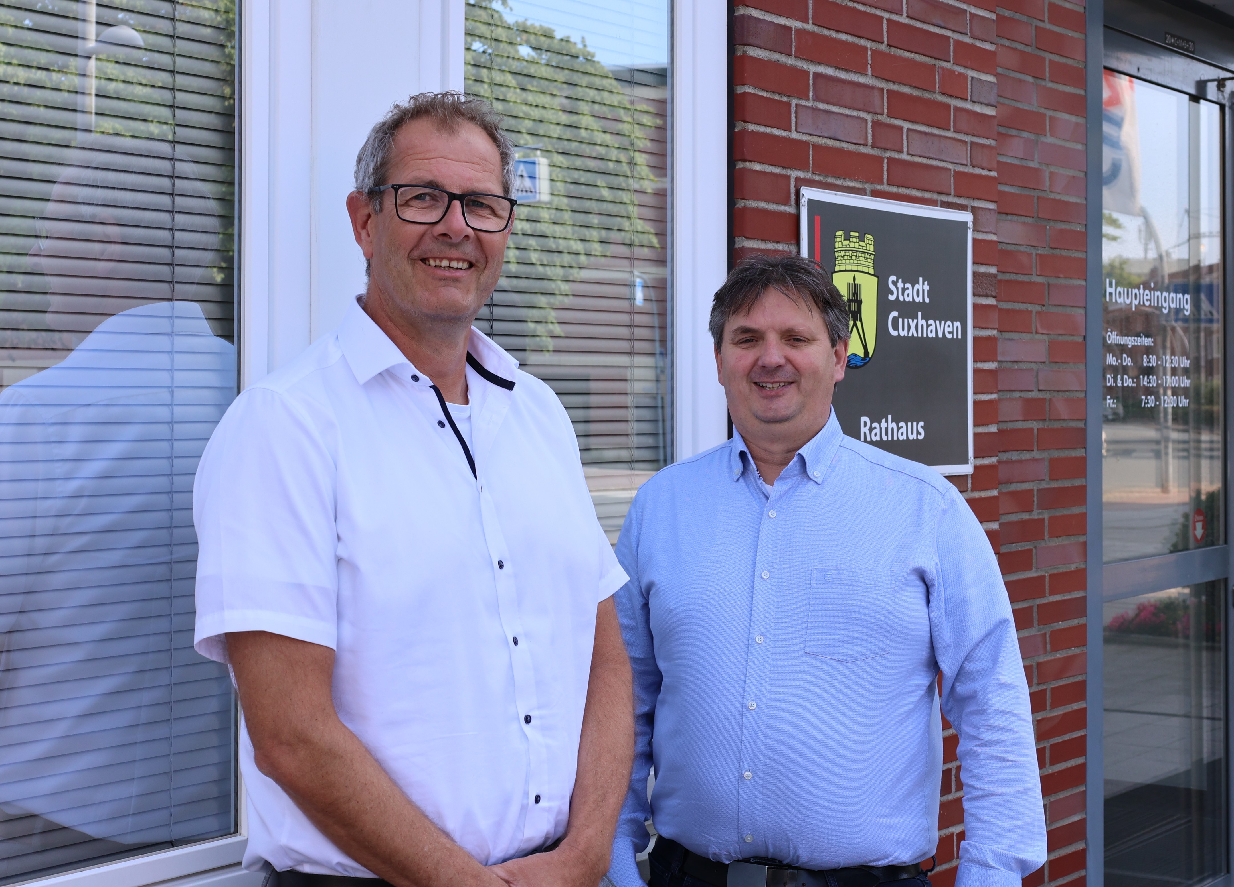 Torsten Köhne (links) freut sich über die Verstärkung durch Swen Sielken, der fortan im Bereich der gewerblichen Abfallüberwachung bei der Stadt Cuxhaven tätig ist. Foto: Stadt Cuxhaven