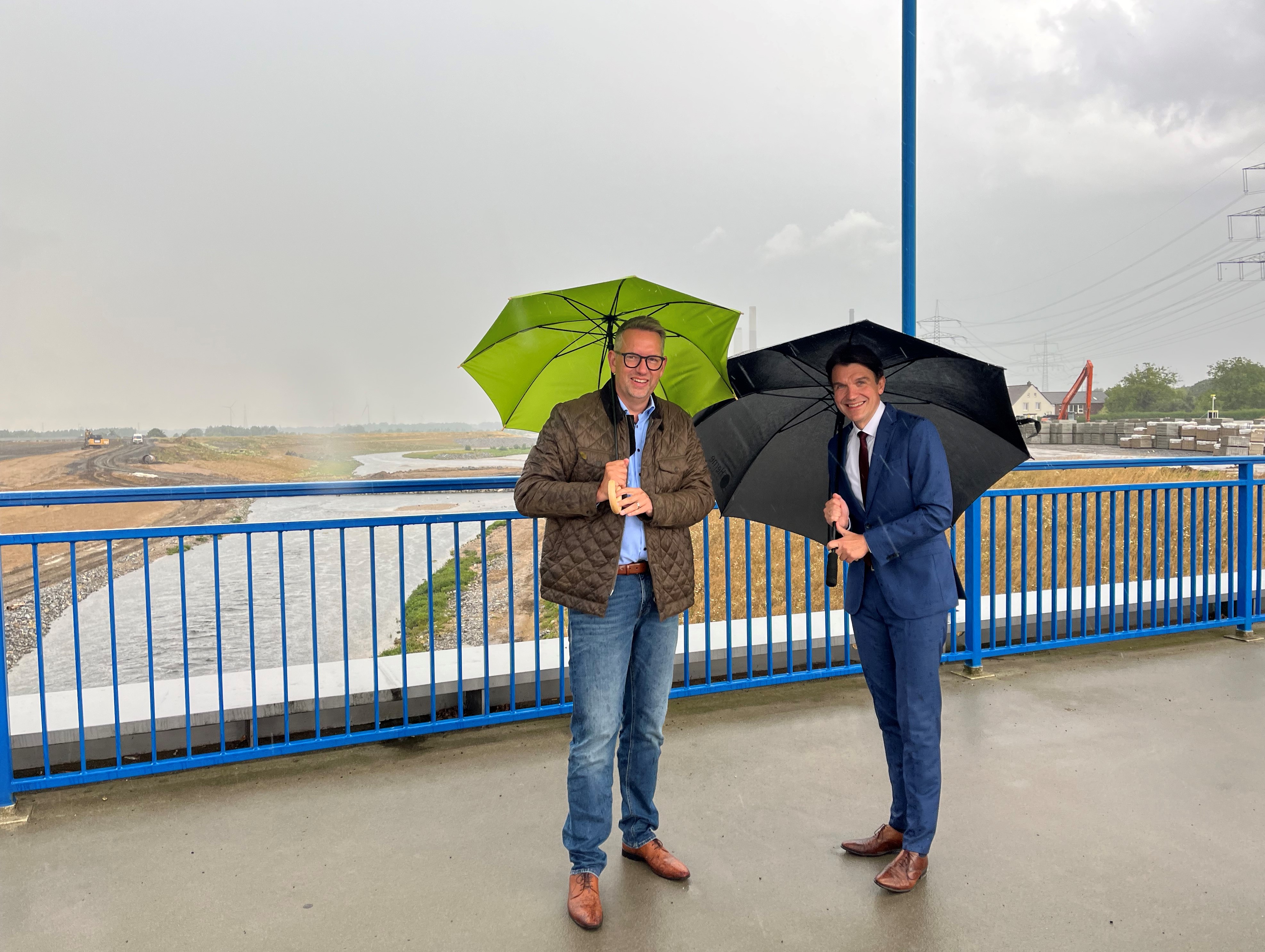 Dem regnerischen Wetter zum Trotz besuchte Ingo Brohl, Landrat des Kreises Wesel, gemeinsam mit dem EGLV-Vorstandsvorsitzenden Prof. Dr. Uli Paetzel die neue Emscher-Mündung.