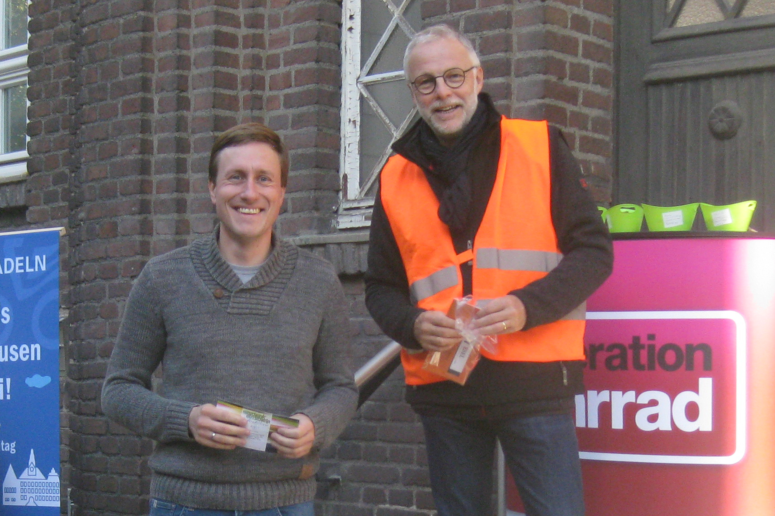 Rückblick auf eine Preisübergabe des Stadtradelns 2022: Bürgermeister Matthias Müller (r.) übergibt Matthias Willeke als Vertreter des Teams „Radelmäuse“ vom Förderverein der Kita St. Josef Disteln den gewonnenen Gutschein (Foto: Stadt Herten).