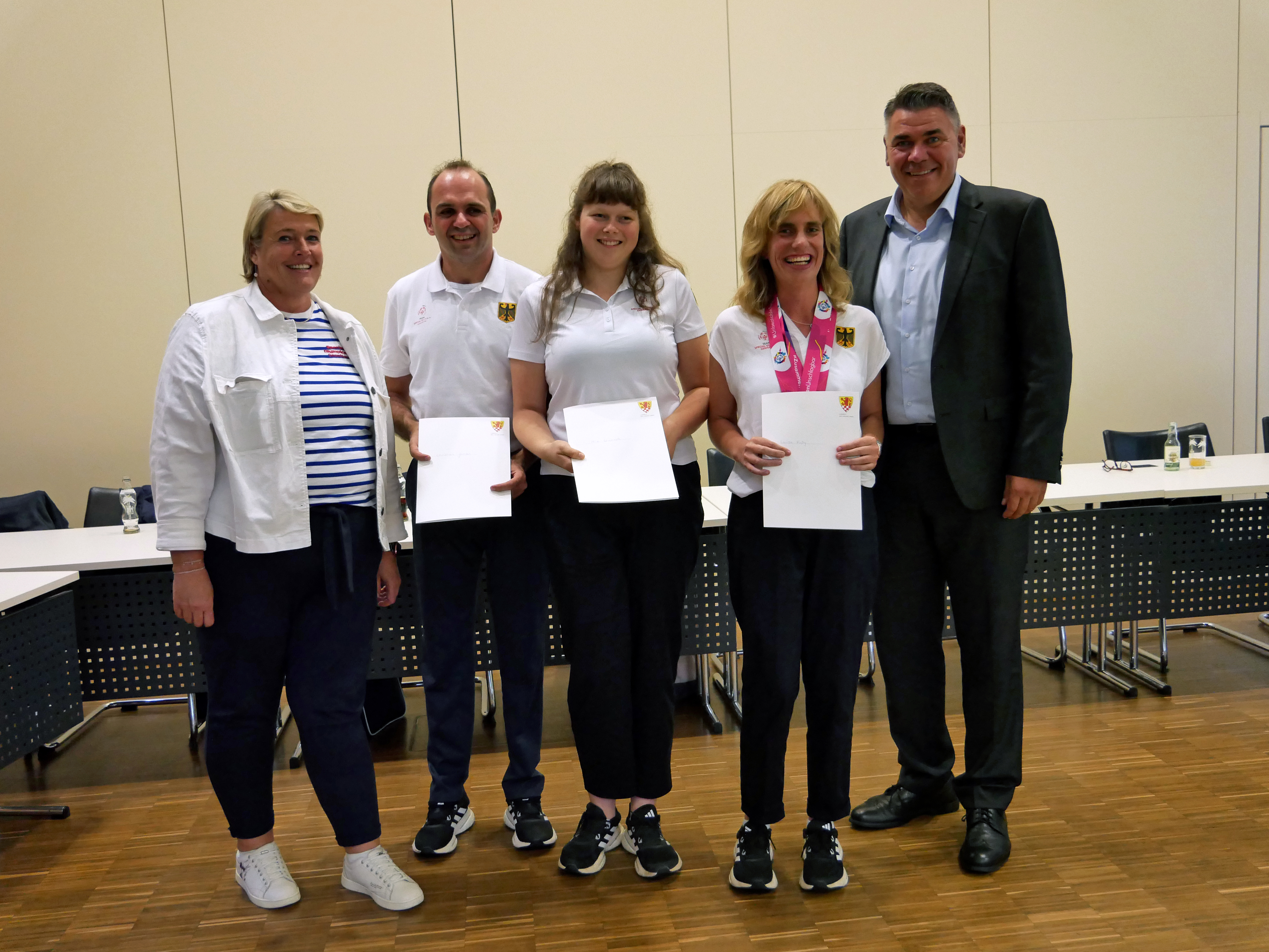 V. l. Trainerin Uta Deutschländer zusammen mit Christian Jansen, Mia Wünsch und Luisa Fußy zum Besuch beim Landrat Mario Löhr. Foto: Leonie Bleimling - Kreis Unna.