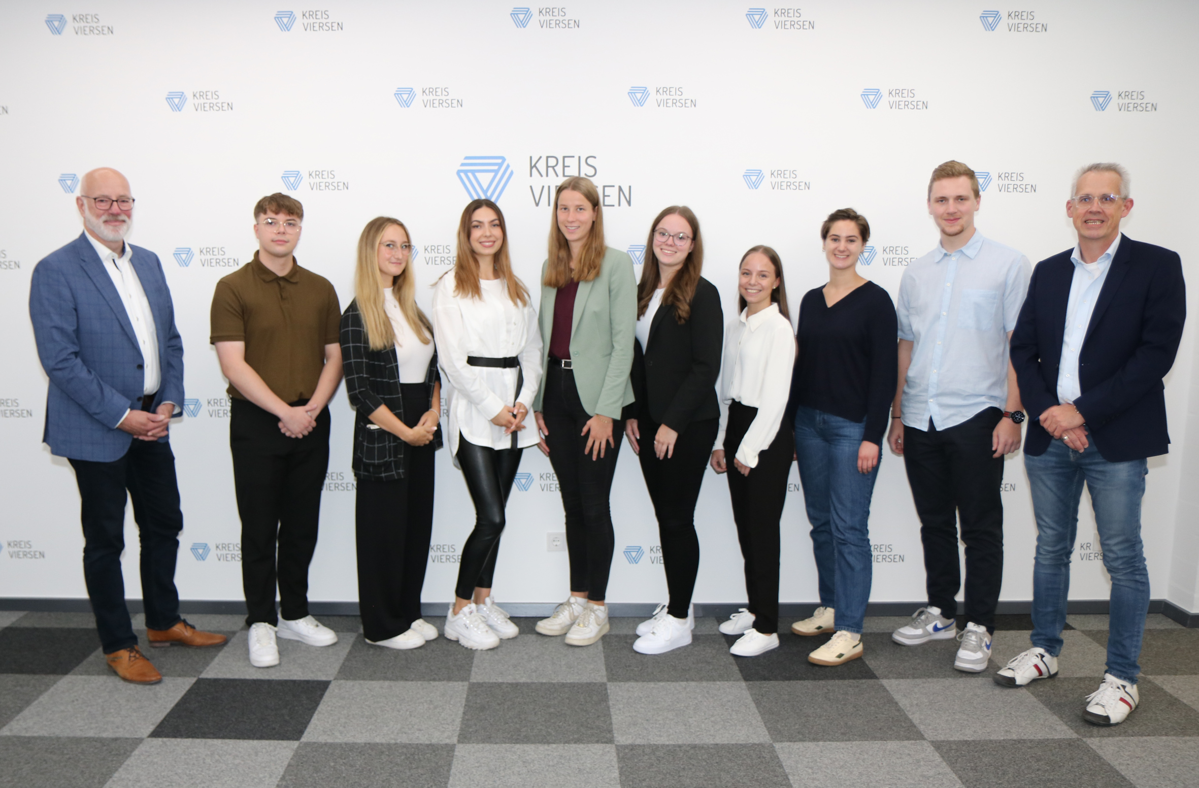 Kreisdirektor Ingo Schabrich (links) und Ausbildungsleiter Volkmar Hörning (rechts) begrüßen die neuen Auszubildenden.