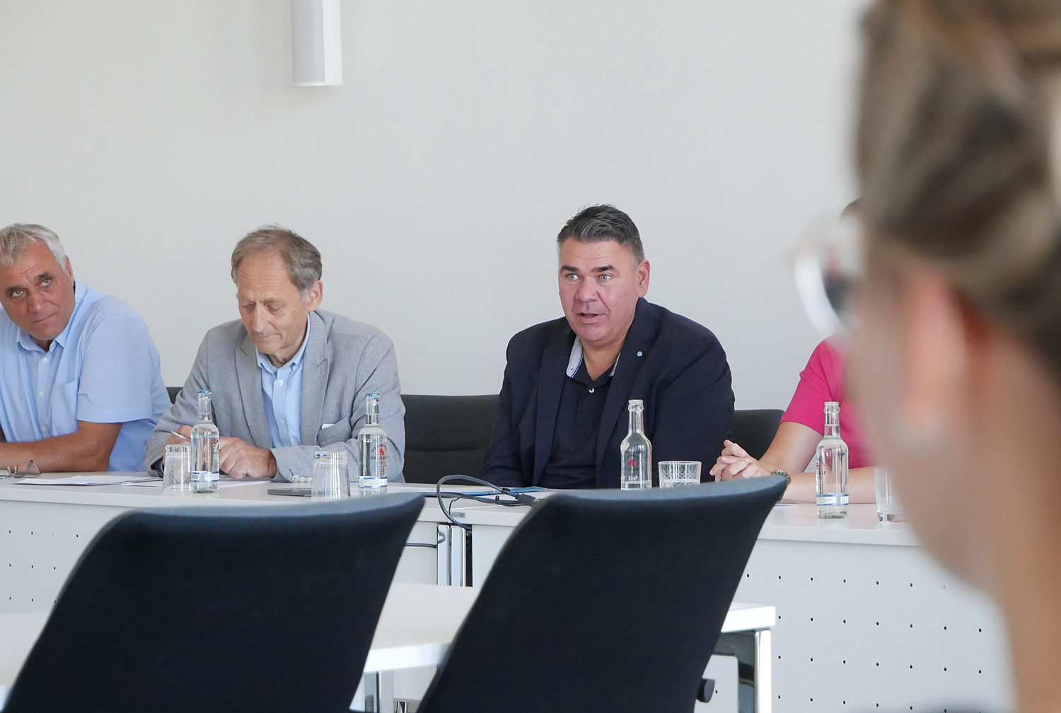 Bildzeile 1: Landrat Mario Löhr bei der Begrüßung im Bönener Rathaus. Links neben ihm Carmen-Geschäftsführer Peter Rummel, ganz links Sozialarbeiter Davit Berisa.