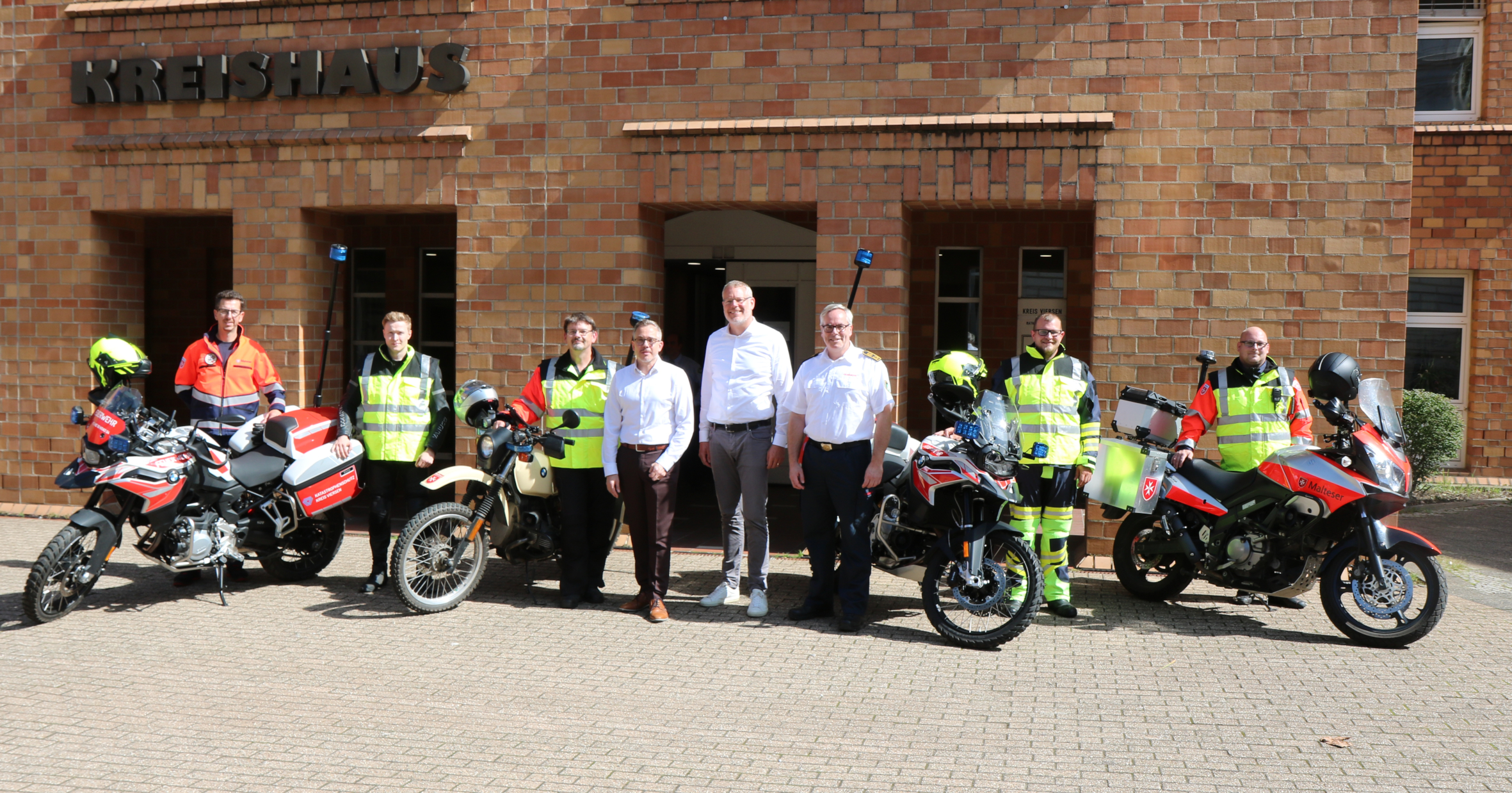 Kollegen der Kradstaffel vor dem Kreishaus Viersen mit Dezernent Jens Ernesti, Landrat Dr. Andreas Coenen und Kreisbrandmeister Rainer Höckels.