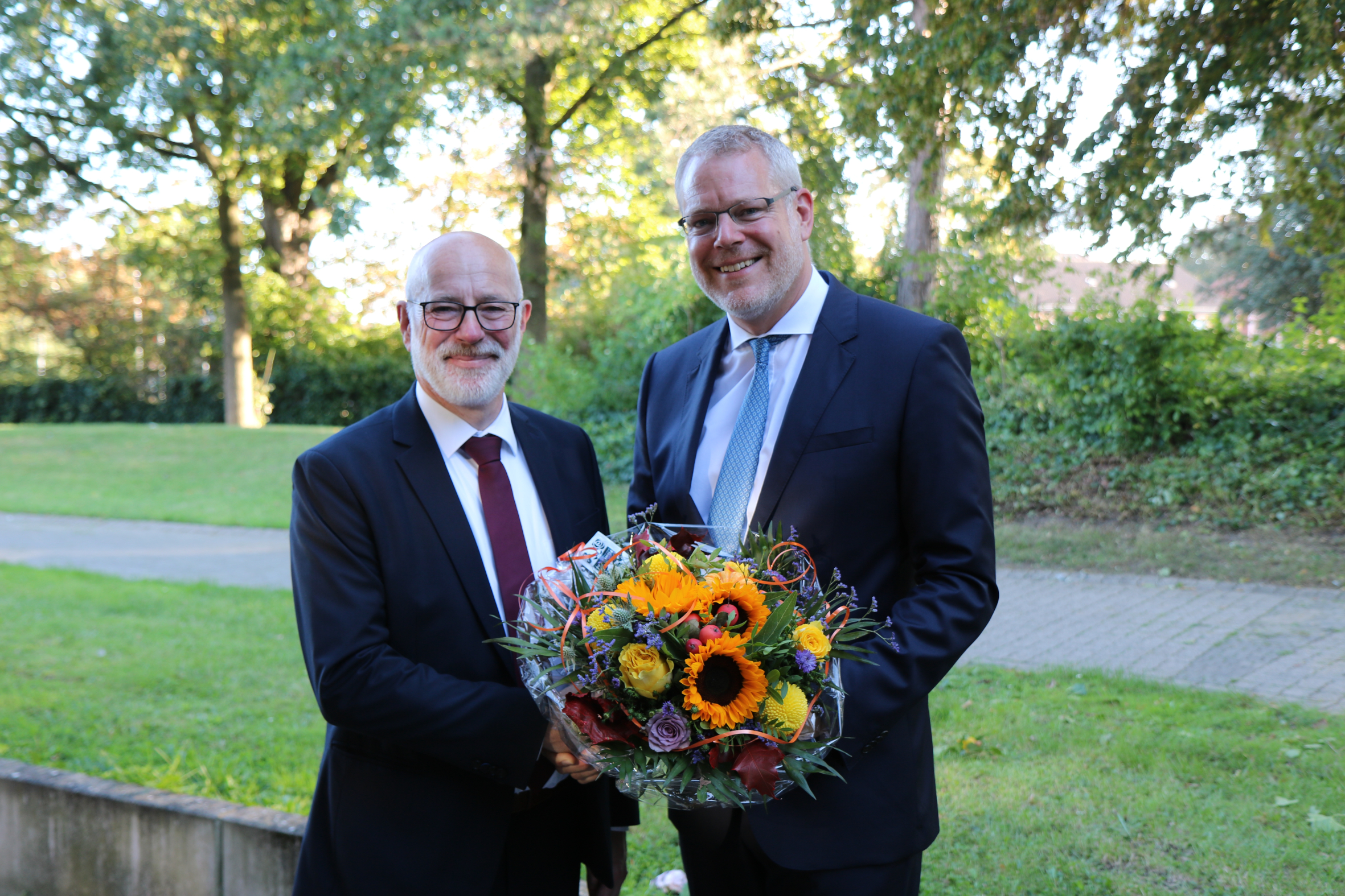 Kreisdirektor Ingo Schabrich (links) wurde einstimmmig vom Kreistag wiedergewählt und erhält Glückwünsche von Landrat Dr. Andreas Coenen.