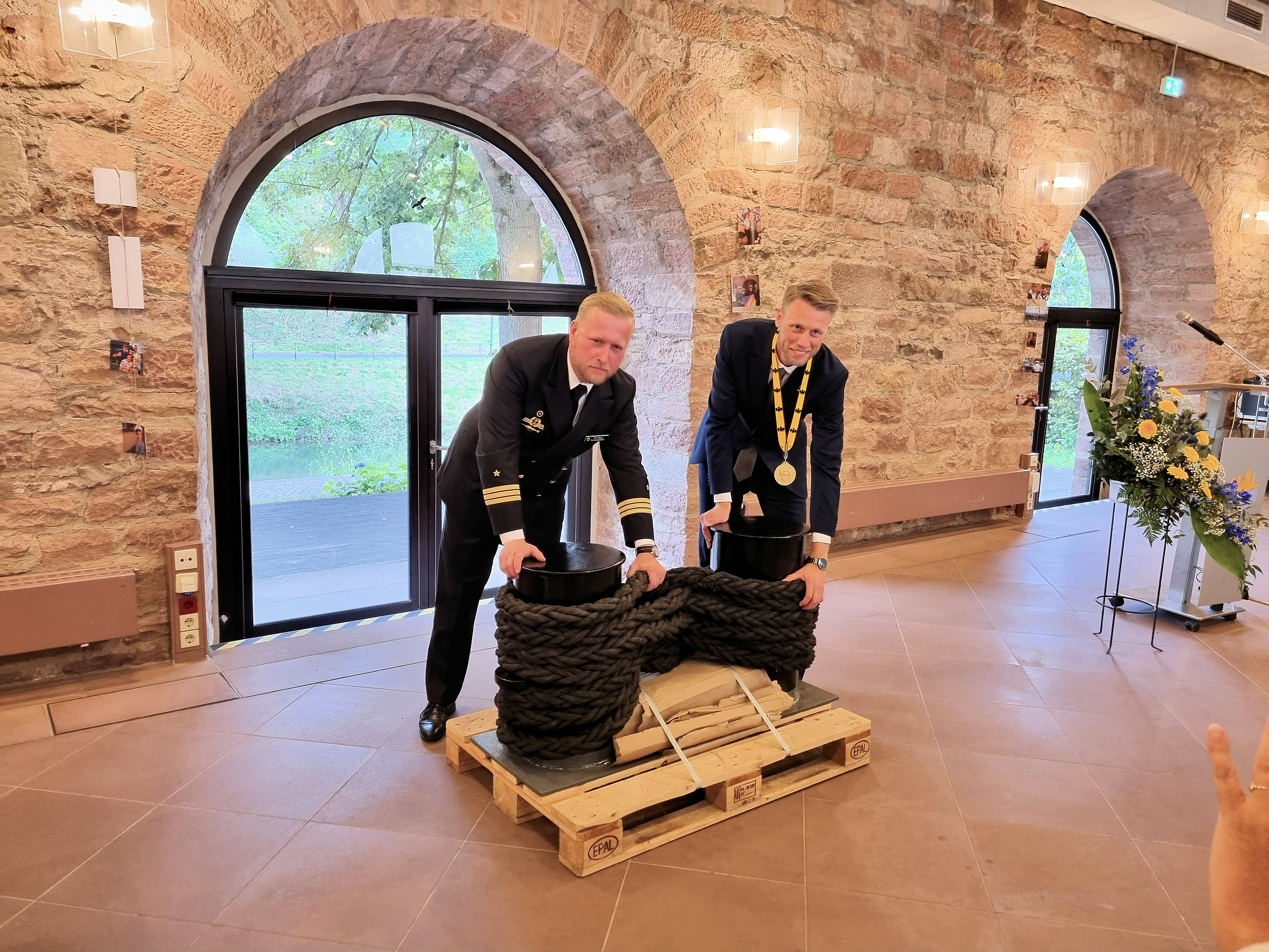 Das Gastgeschenk der Tender-Besatzung: ein Poller mit dicken schwarzen Tauen umwickelt als Symbol der engen Verbindung. Foto: Stadt Wertheim