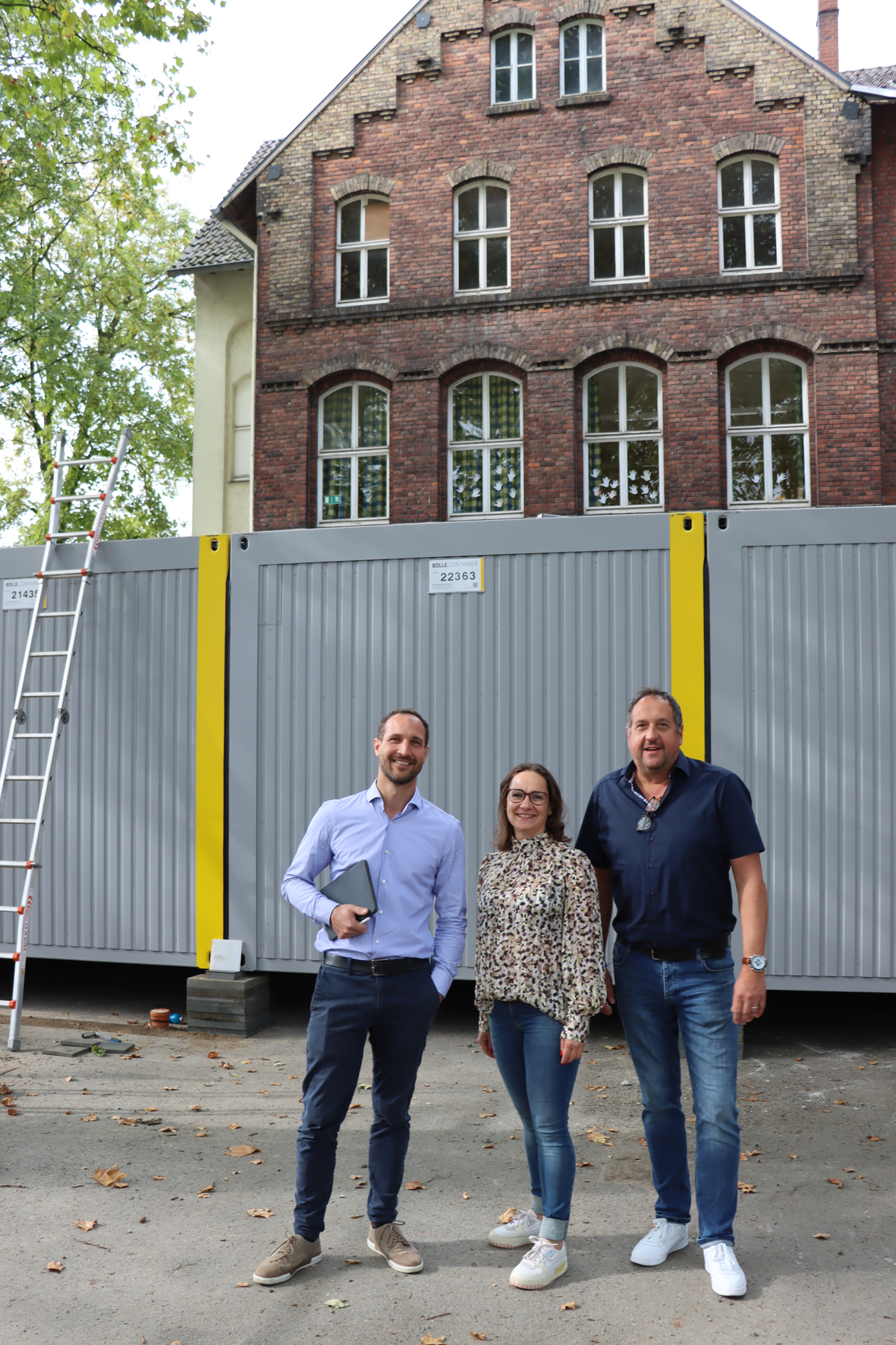Michael Graetsch, Agnes Urban und Andreas Maske vom Hertener Immobilienbetrieb (HIB) freuen sich, dass die Raummodule innerhalb der Herbstferien auf den Schulhof installiert werden konnten.