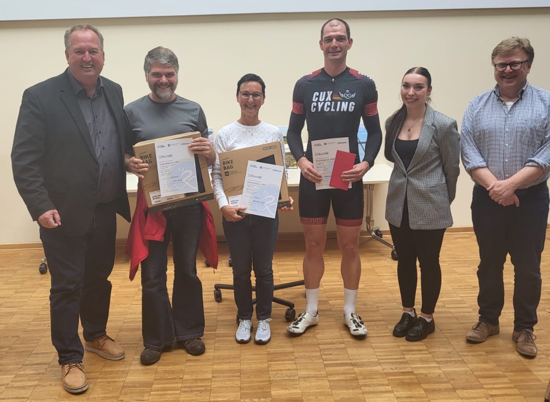 Oberbürgermeister Uwe Santjer (links) überreichte gemeinsam mit Baudezernent Andreas Eickmann (rechts) und STADTRADELN-Koordinatorin Denise Wächter (2.v.r.) die Preise an die Siegerinnen und Sieger. Foto: Stadt Cuxhaven