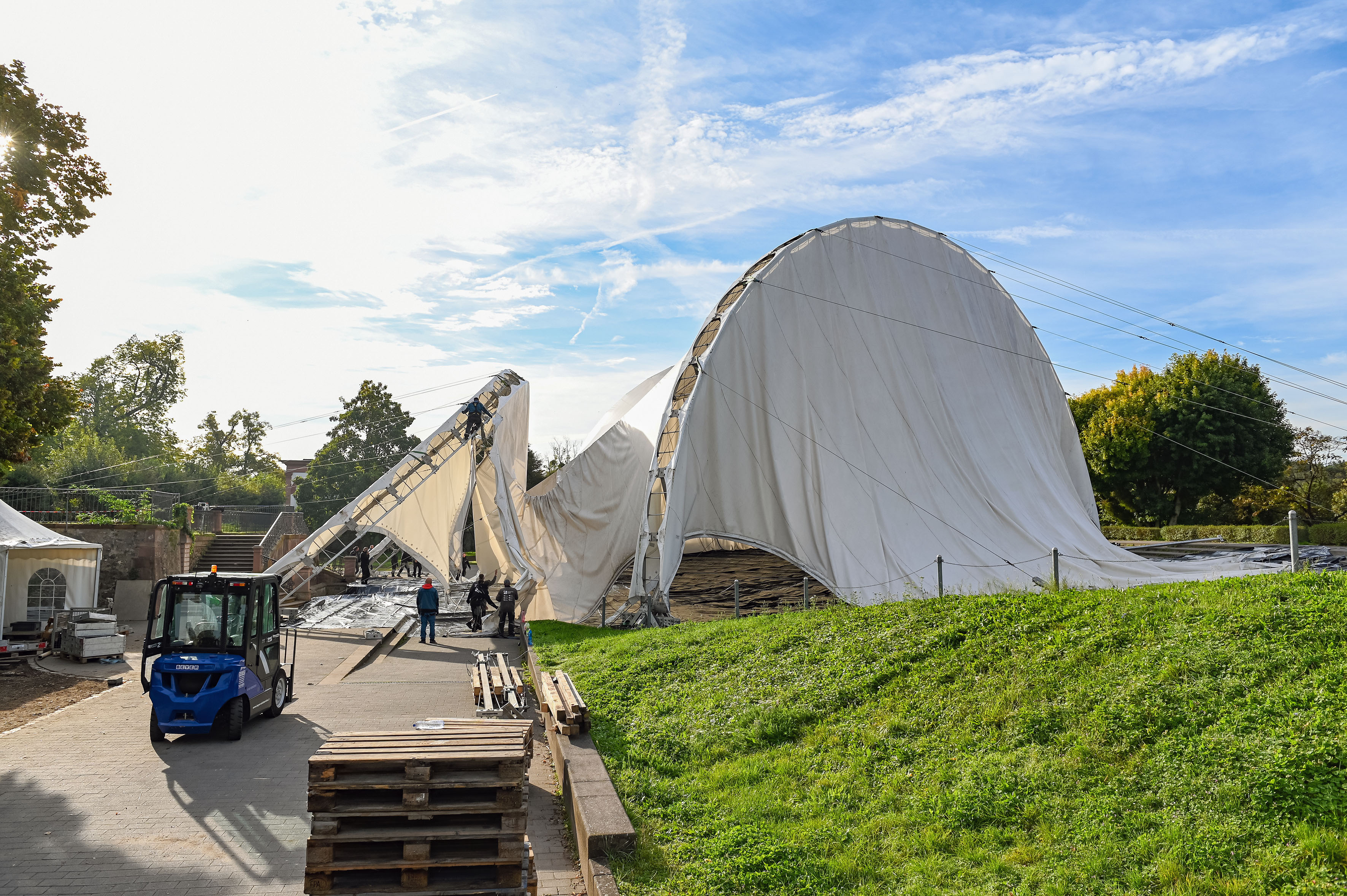 Eine Spezialfirma demontiert jährlich das Dach des "Amphi". Die Zeltmembrane wird anschließend gereinigt und eingelagert, ehe sie im Frühjahr des Folgejahres wieder montiert wird. Dies sorgt für mehr Langlebigkeit des Materials.