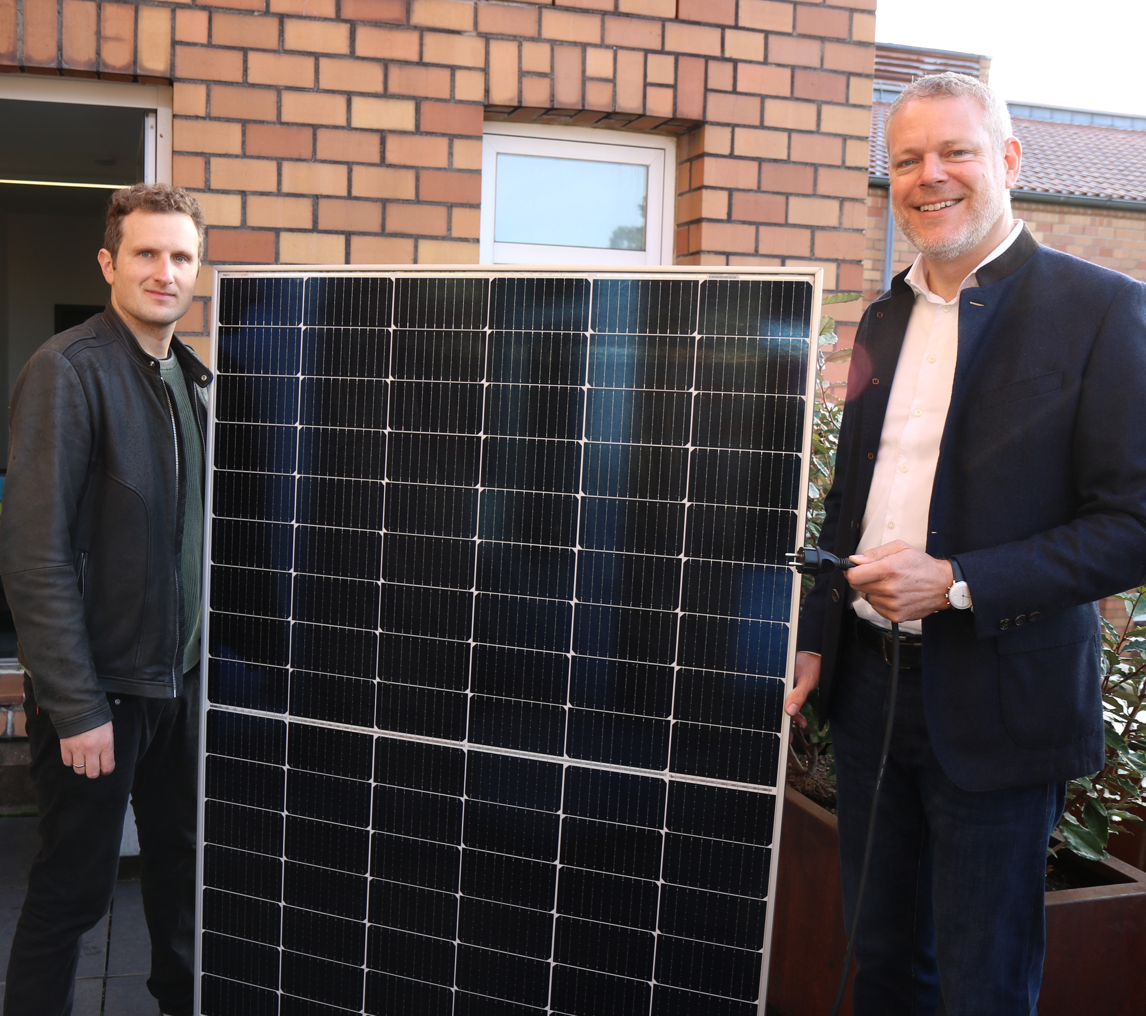 Landrat Dr. Andreas Coenen und Klimaschutzmanager Felix Schütte nehmen ein Balkonkraftwerk in Augenschein.