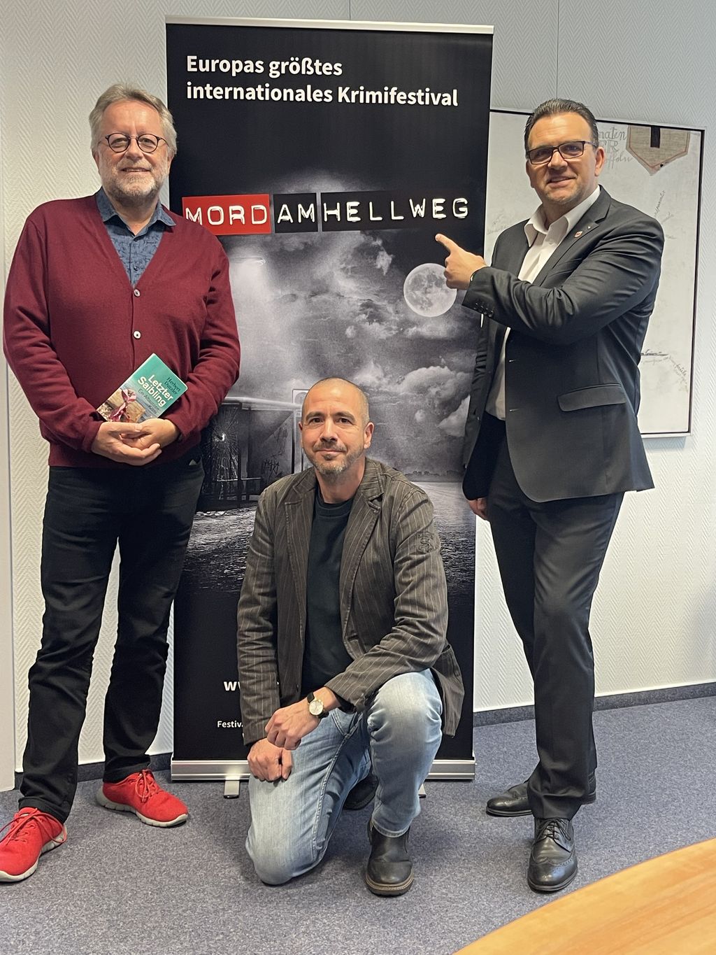 Freuen sich auf "Mord am Hellweg 2024" und die Anthologie zum Thema "Heimat & Verbrechen": v.l. Herbert Dutzler (österr. Krimiautor), Heiner Remmert (Leiter Westfälisches Literaturbüro in Unna e.V.) und Bürgermeister Michael Joithe.