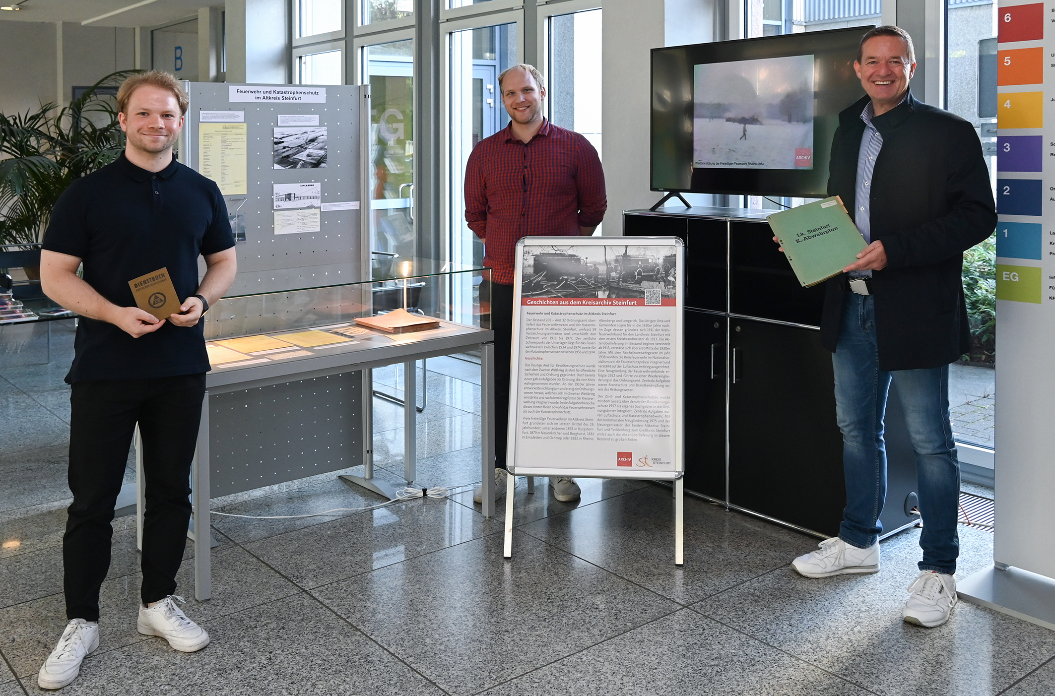 Kreis-Dezernent Dr. Karlheinz Fuchs (r.) freut sich über den historischen Einblick in das Ordnungswesen, den Archiv-Praktikant Yannik Schumacher (l.) und Kreisarchivar Jannik Schröder präsentieren.