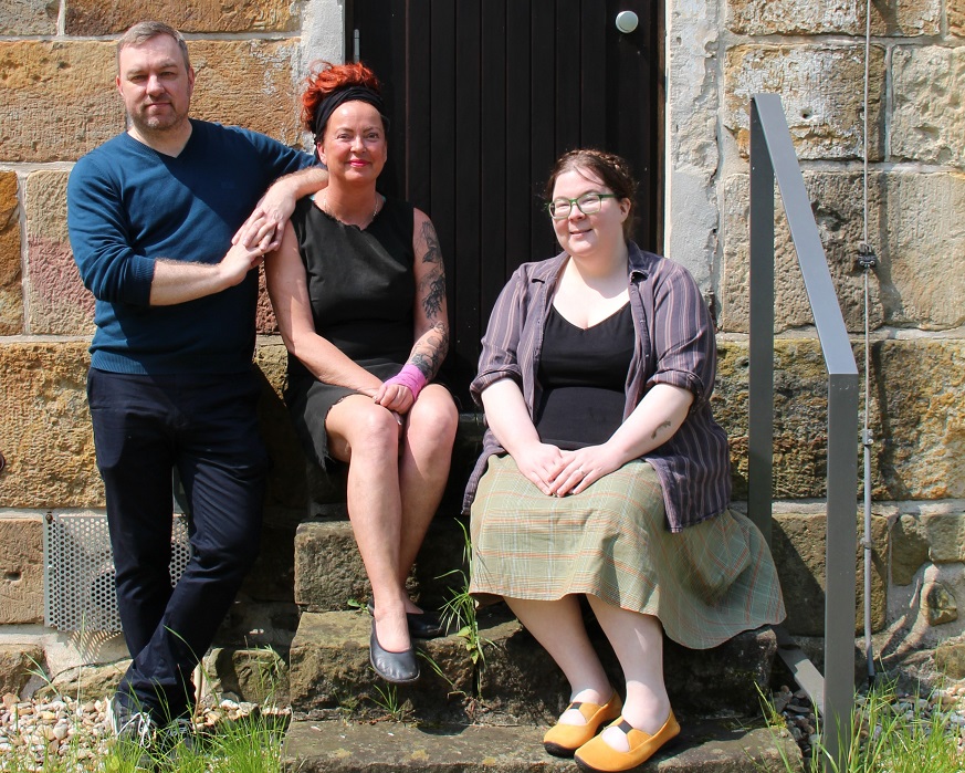 Die Künstler Janne Laine, Künstlerinnen Tiina Kivinen und Minna Louhelainen während ihres Arbeitsaufenthalts in der Druckwerkstatt von Kloster Bentlage.