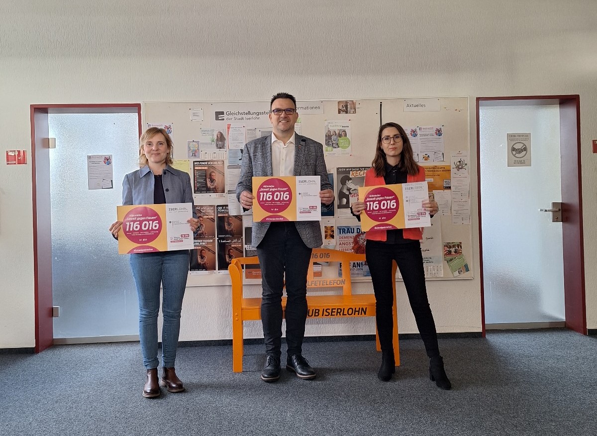 Frauen- und Mädchenberaterin Marina Himmelberg (l.), Bürgermeister Michael Joithe und Gleichstellungsbeauftragte Patricia da Cruz Santos machen auf das Angebot des Hilfetelefons aufmerksam.