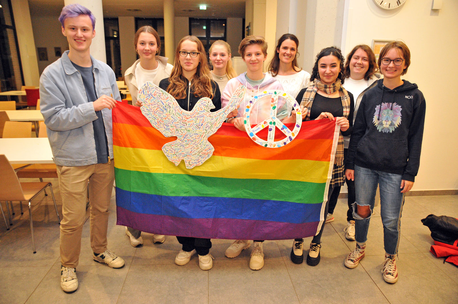 Schule gegen Rassismus - Schule mit Courage: Die Schülergruppe des St. Georg-Gymnasium brachte Symbole mit, um die Haltung der Schule zu verdeutlichen.