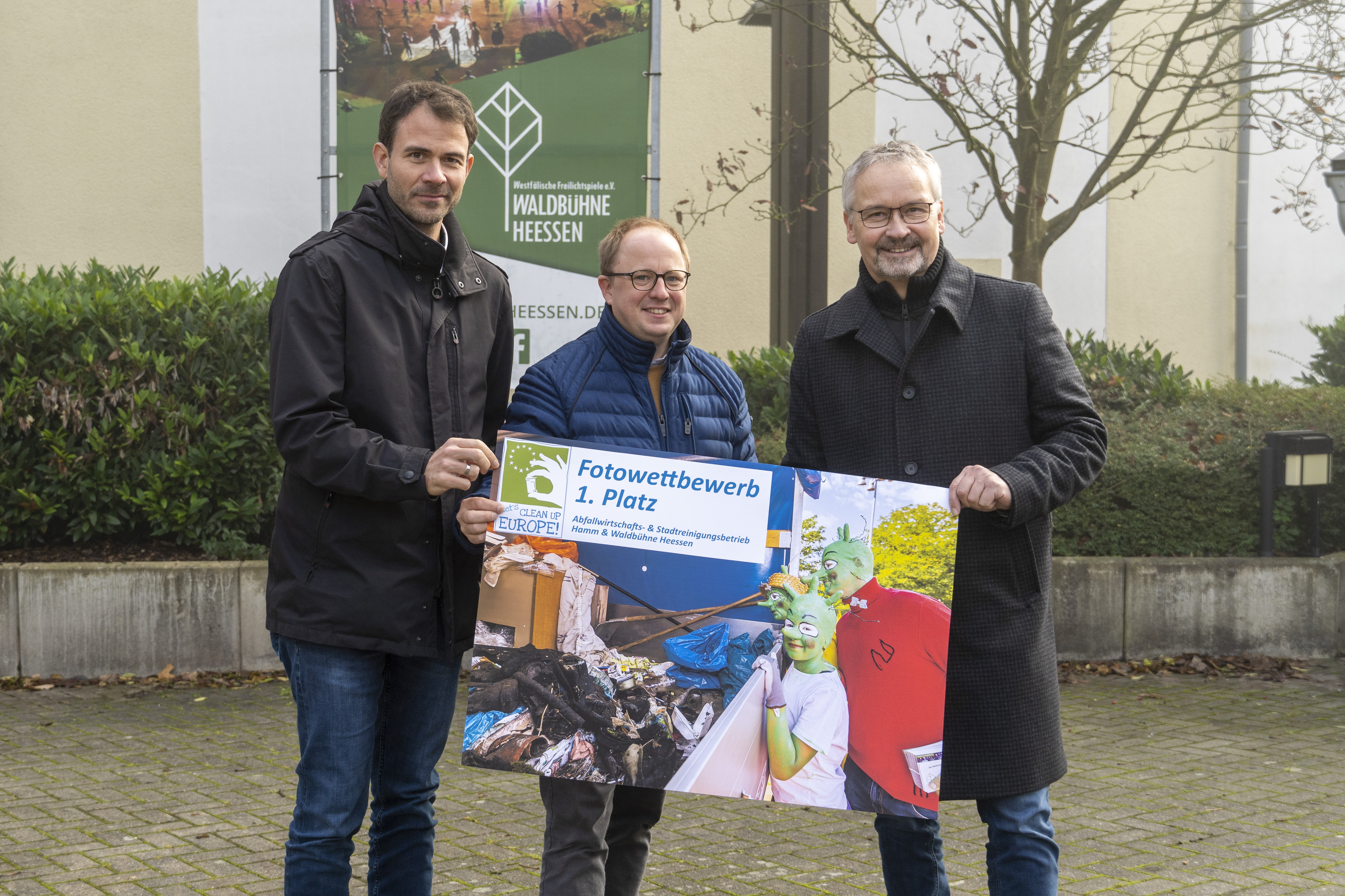 v.l.n.r.: ASH-Betriebsleiter Robert Reminghorst, Fotograf Thorsten Hübner und Andreas Brochtrop-Wegerich, 1. Vorsitzender des Waldbühne Heessen e.V., zeigen das Foto, das den Wettbewerb gewonnen hat.