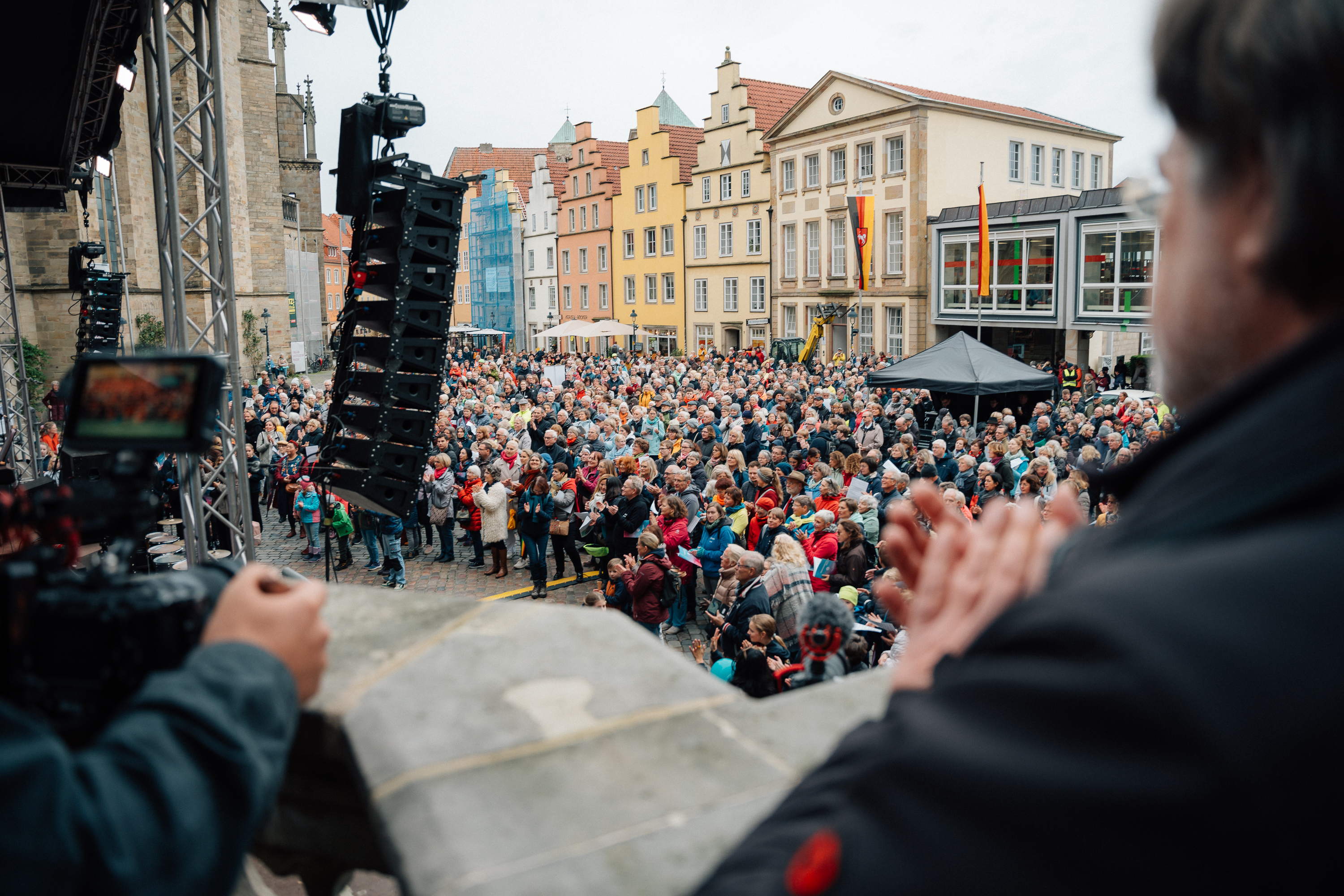 Die Sonderveranstaltungen zum Jubiläum füllten den Markt vor dem historischen Rathaus mehrere Male, hier beim Friedenssingen zum Jahrestag der Verkündigung des Westfälischen Friedens am 25. Oktober.