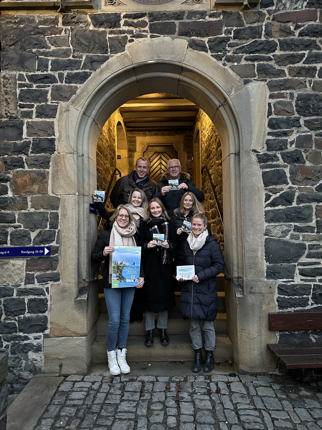 Werben für das neue Booklet „LenneSchiene...erleben“ zum Kennenlernen der Region: Detlef Krüger (l., Märkischer Kreis) und Dirk Matthiesen (Iserlohn) sowie (v.l.) Fabienne Glänzel (Werdohl), Hana Beer (FTV Märkisches Sauerland e.V.), Vivien Bömer (Plettenberger KulTour GmbH), Sylvia Eick (Plettenberger KulTour GmbH), Clarissa Zell (LEADER-Region LenneSchiene). Es fehlen: Melanie Spelsberg (Altena), Ludwig Rasche (Finnentrop), Sebastian Putz (Nachrodt-Wiblingwerde), Simone Korte und Kristina Zander (beide Iserlohn).