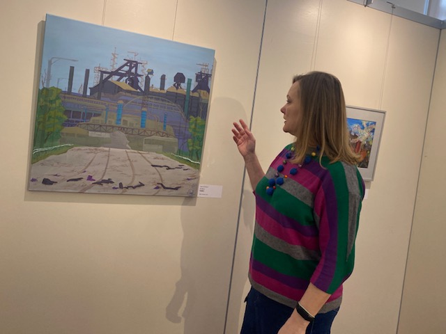 Künstlerin Olena Ukraintseva aus der Ukraine mit ihrem Bild in der Ausstellung PostMost im Hoesch-Museum.