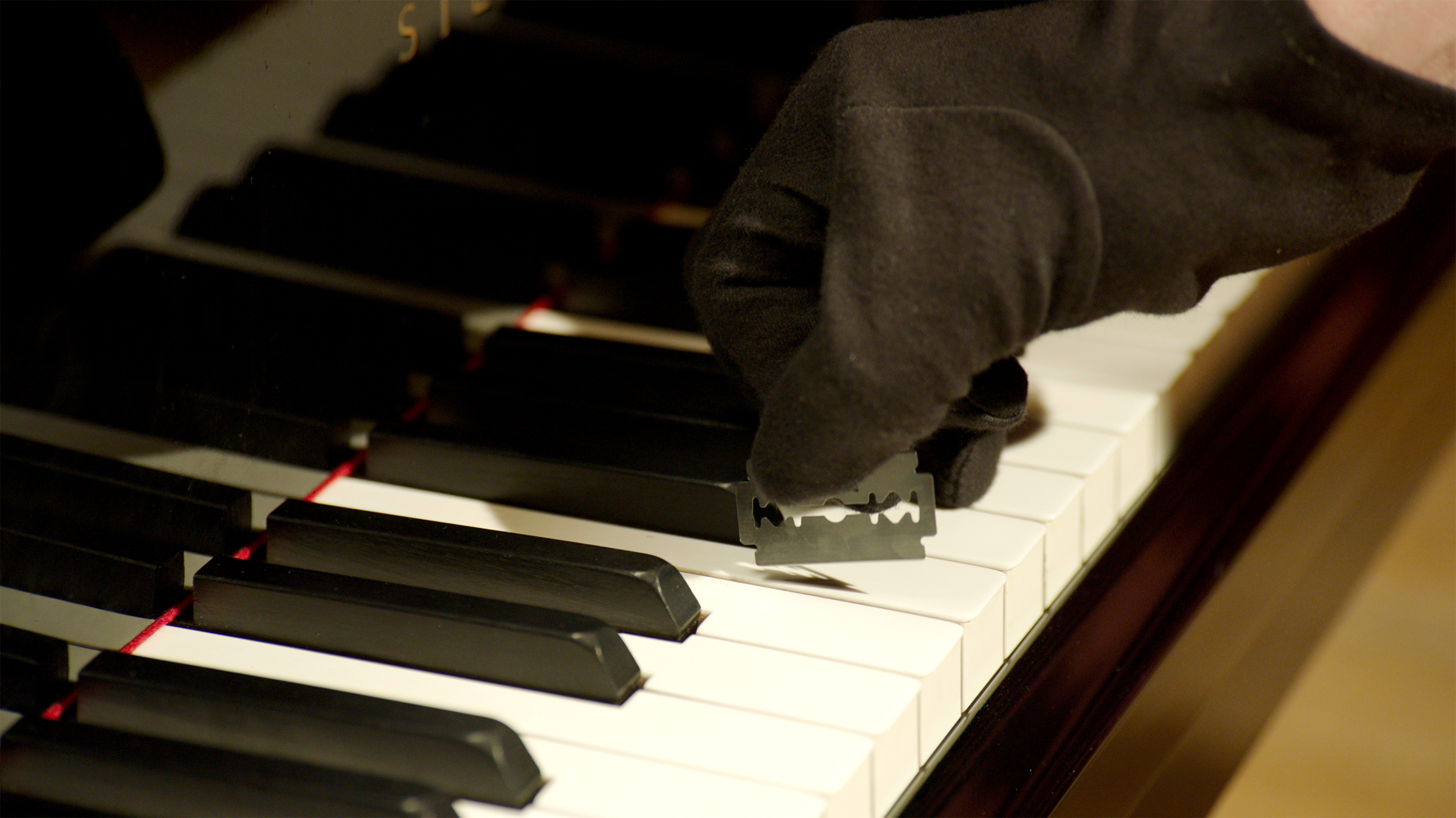 Zu sehen ist ein Screenshot aus einer Videoinstallation des Künstlers, im Schaufenster des Museum Ostwall. - Dani Gal, Three Works For Piano, 2020 .