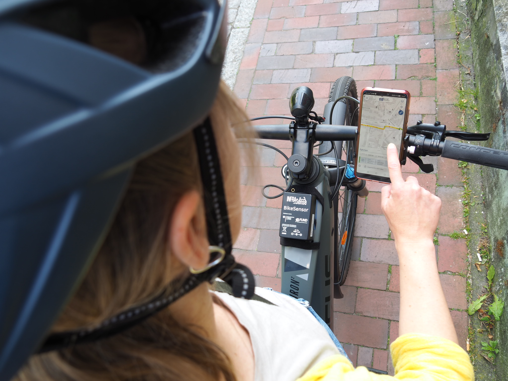 Eine Radfahrerin, die den Infrasense-Sensor an ihrem Fahrrad montiert hat, betrachtet die Daten in der BIQEmonitor-App.