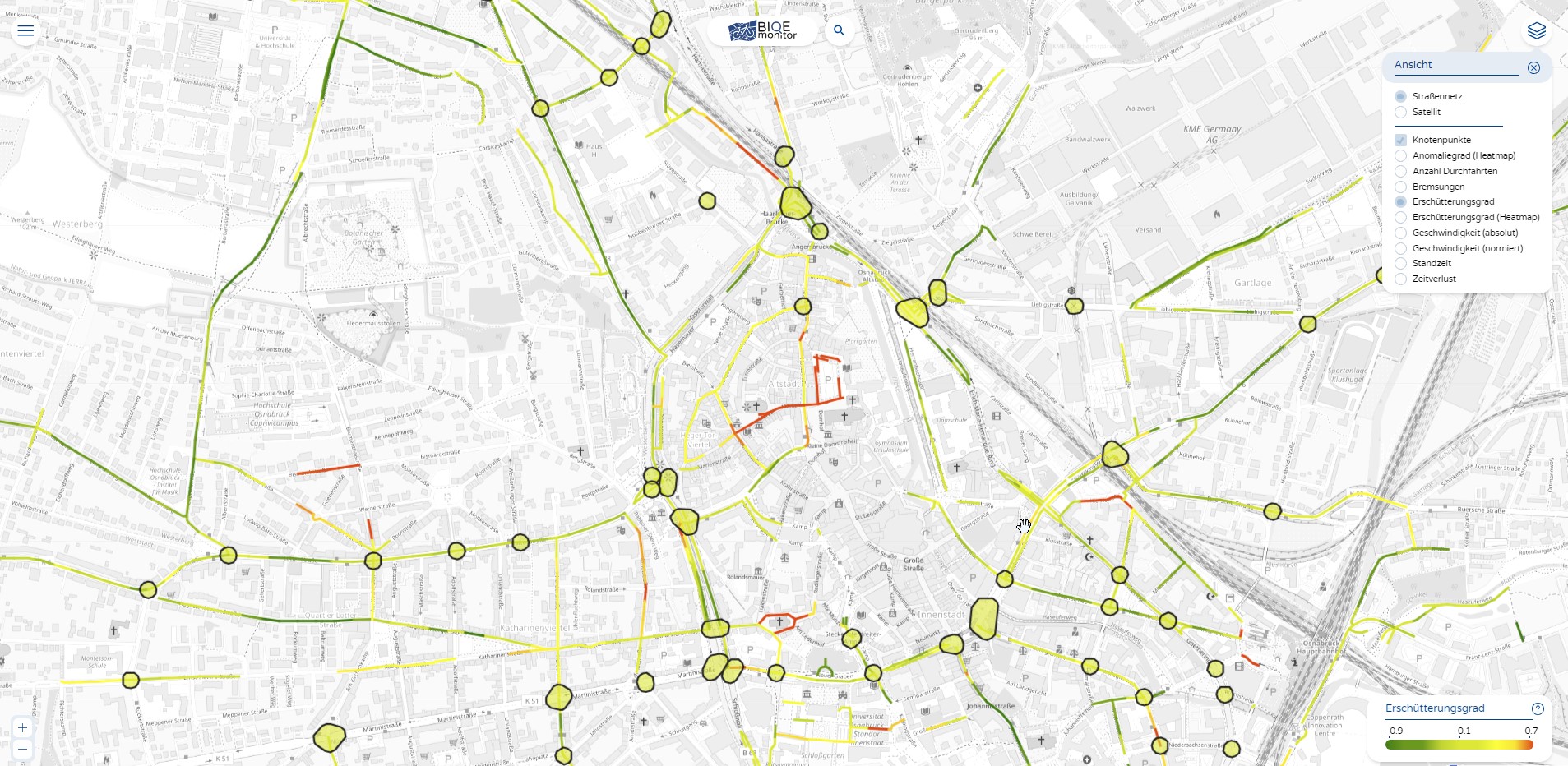 Der sogenannte BIQEmonitor zeigt den Erschütterungsgrad an, den Infrasense-Sensoren auf Osnabrücker Radstrecken ermittelt haben.