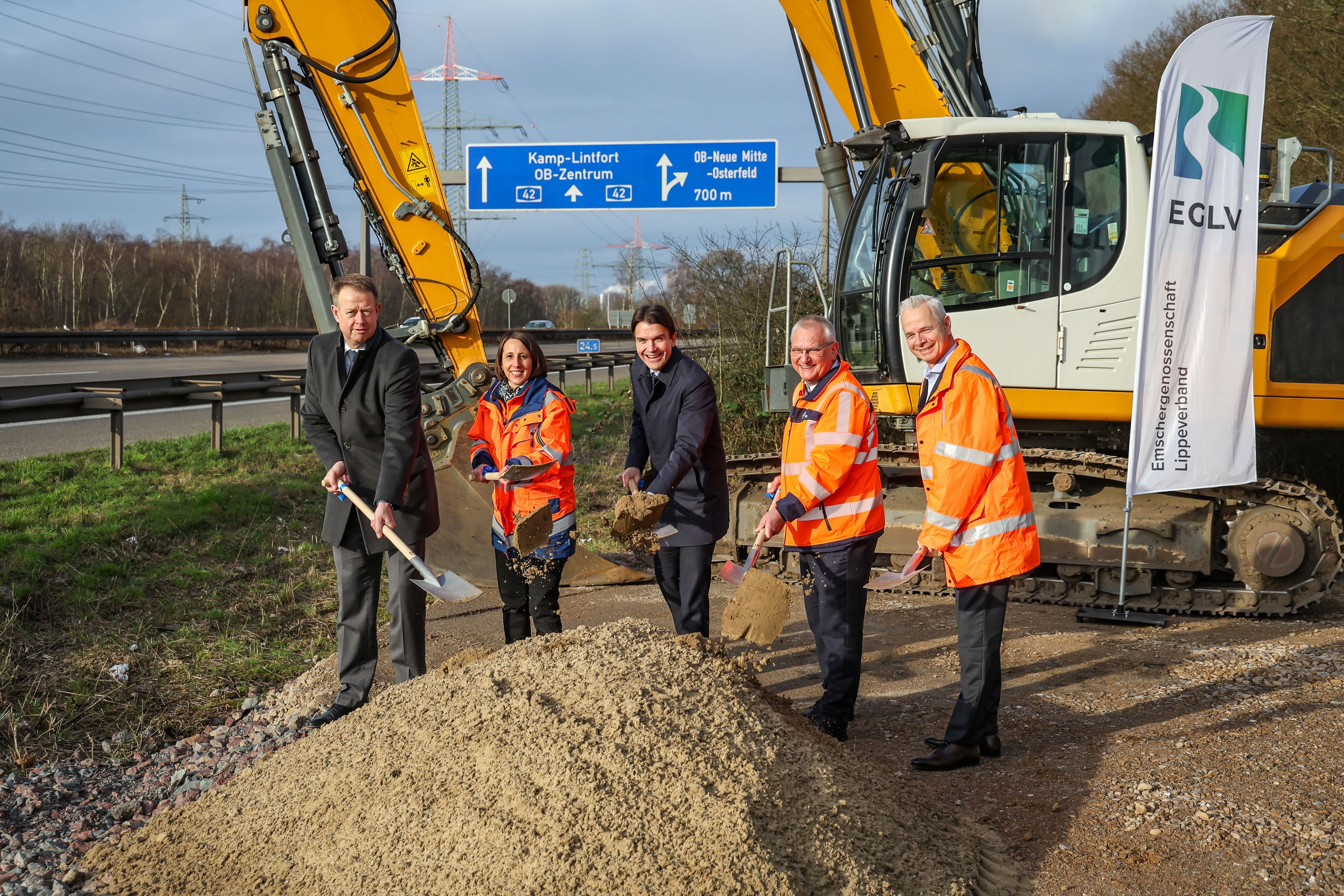 Führten den Spatenstich für die Regenklärung an der A42 aus: v.l. Michael Kalthoff, stellvertretender Vorsitzender des Genossenschaftsrates der Emschergenossenschaft, Projektleiterin Beate Fricke von der Emschergenossenschaft (EG), Vorstandsvorsitzender der EG Prof. Dr. Uli Paetzel, Thomas Ganz (Niederlassungsleiter der Autobahn GmbH im Rheinland) und Technischer Vorstand der EG Dr. Frank Obenaus.