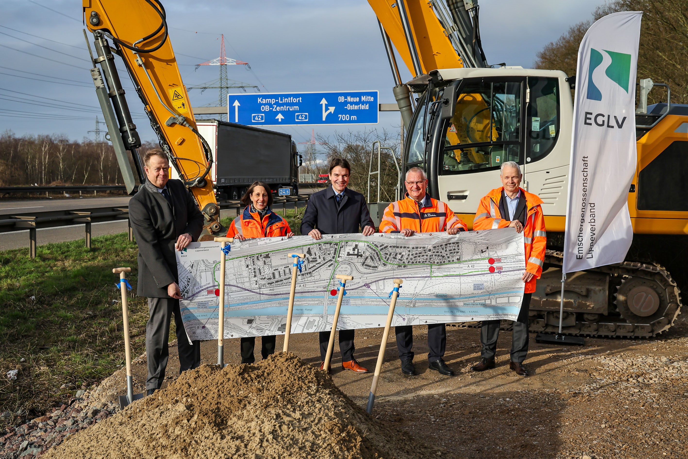 Vier Regenkläranlagen (auf dem Plan mit roten Punkten gekennzeichnet) baut die Emschergenossenschaft an der A42: v.l. Michael Kalthoff, stellvertretender Vorsitzender des Genossenschaftsrates der Emschergenossenschaft, Projektleiterin Beate Fricke von der Emschergenossenschaft (EG), Vorstandsvorsitzender der EG Prof. Dr. Uli Paetzel, Thomas Ganz (Niederlassungsleiter der Autobahn GmbH im Rheinland) und Technischer Vorstand der EG Dr. Frank Obenaus.