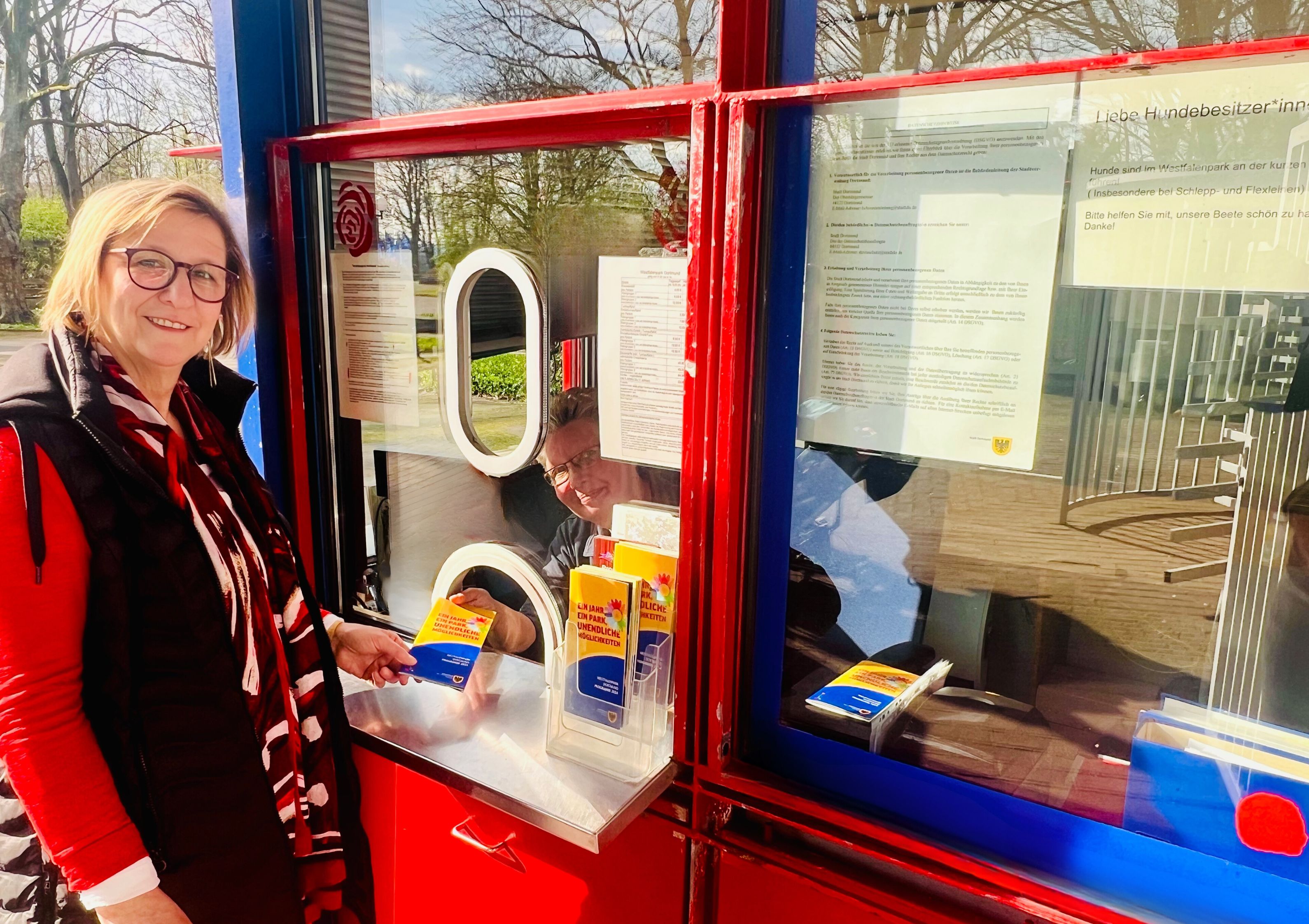 Annette Kulozik, Leiterin Geschäftsbereich Parkanlagen bei Sport- und Freizeitbetriebe Stadt Dortmund, die mit ihrem langjährigen Engagement den Westfalenpark geprägt hat und nun in den Ruhestand geht, empfängt aus den Händen von Petra Wagner, Kassiererin am Eingang Ruhrallee, das neue Programmheft.